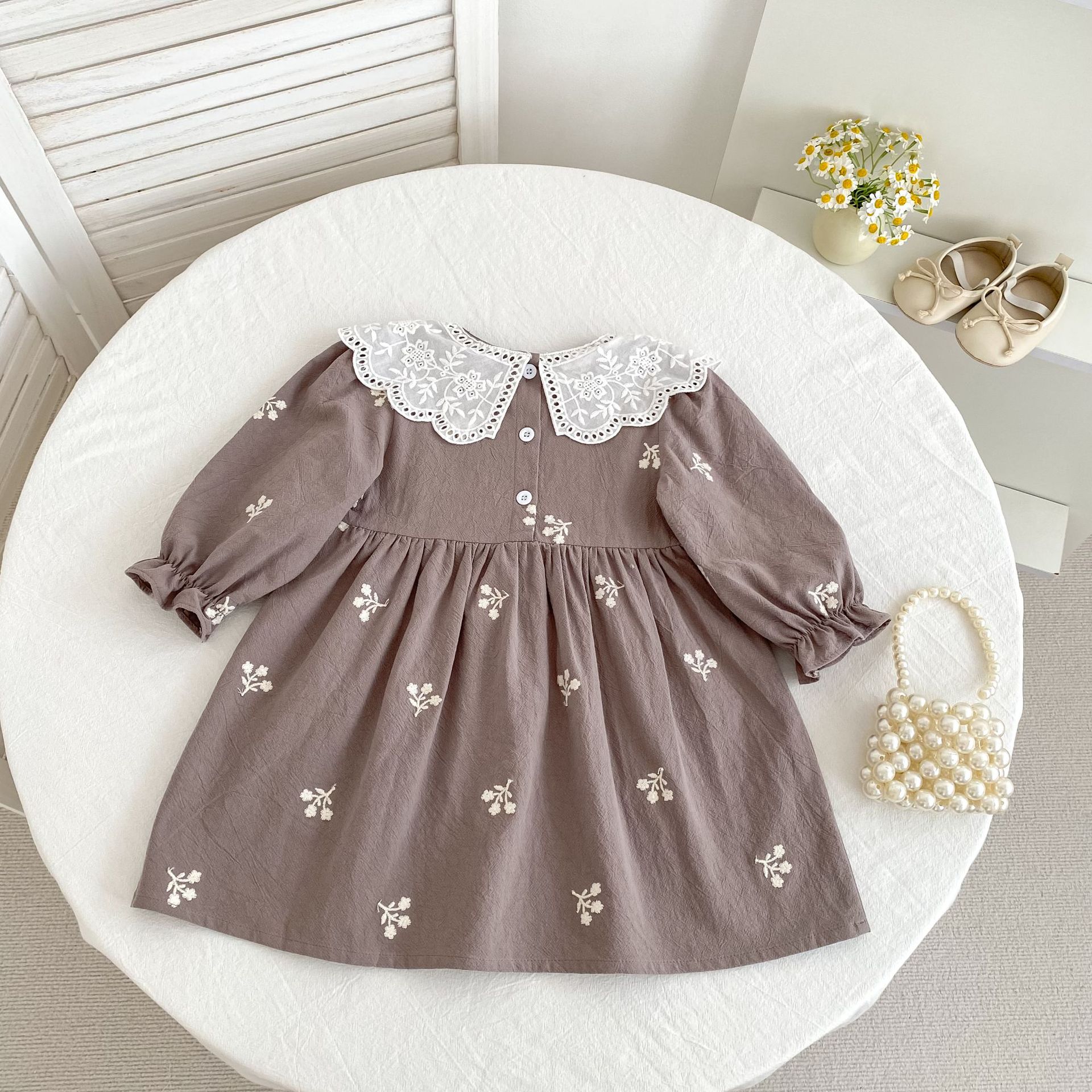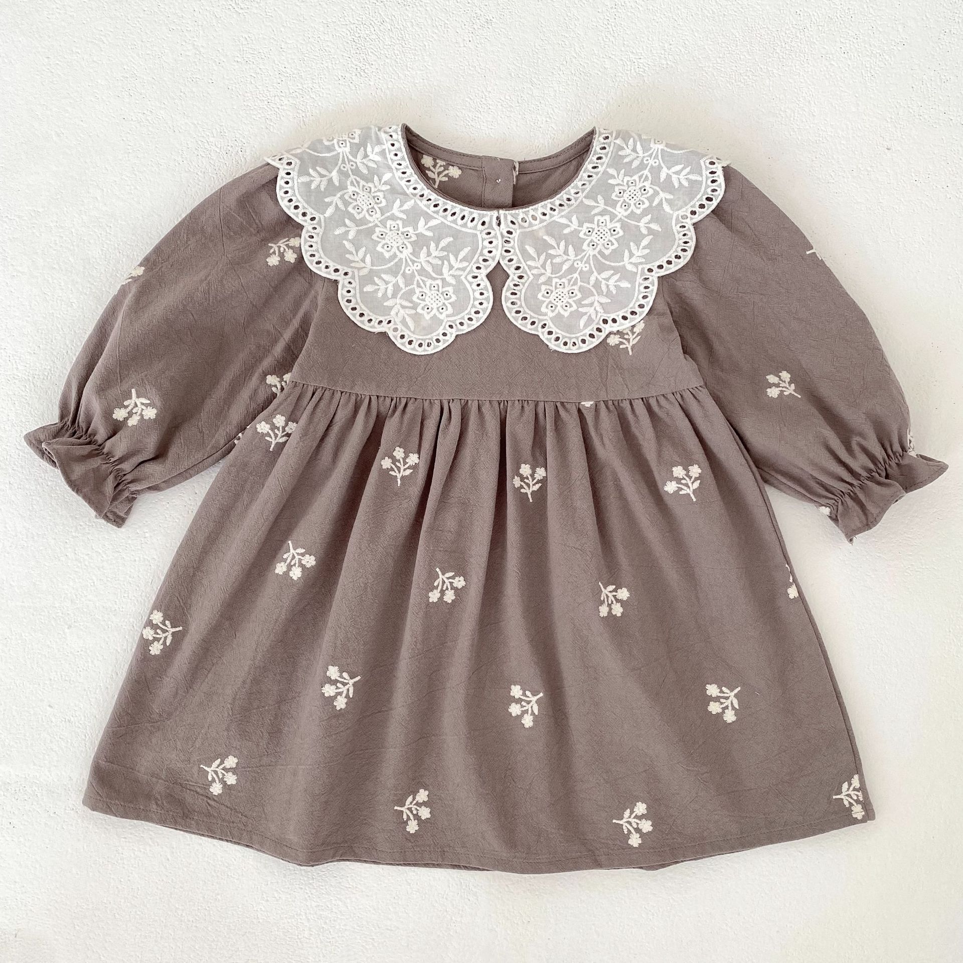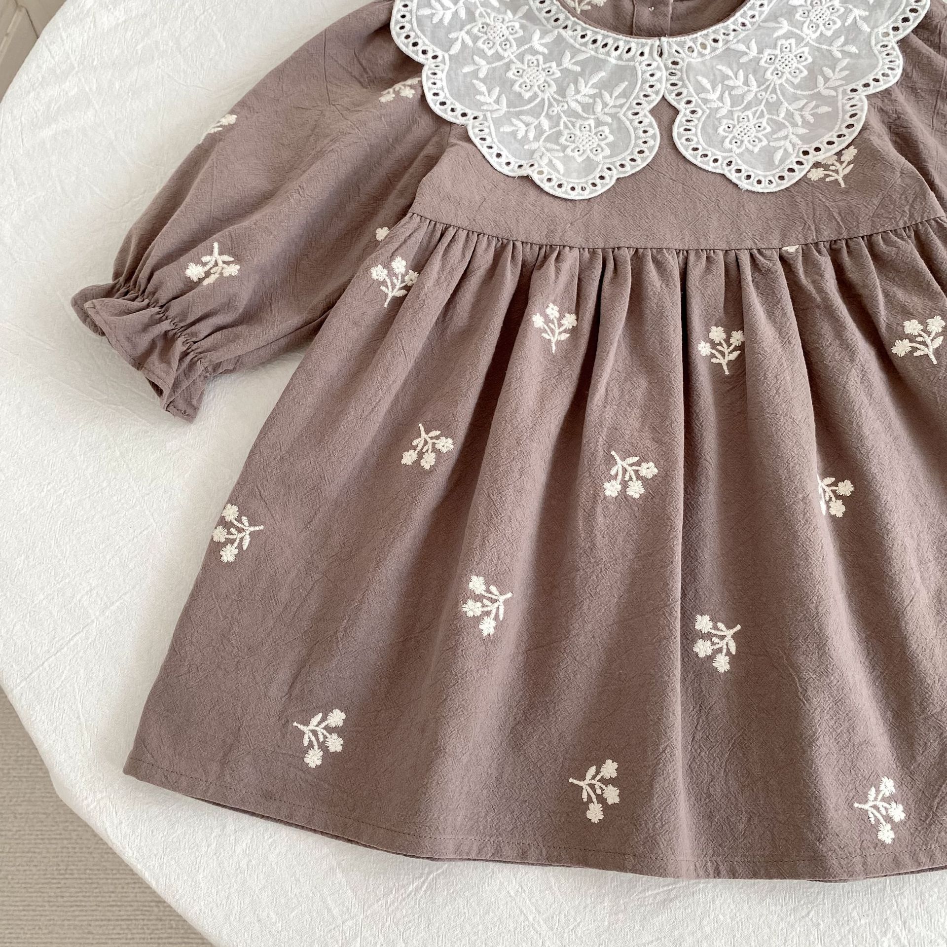 فستان بناتي بتصميم مزين بياقة بدانتيل مطرزة وأكمام طويلة، مع تطريزات زهور رقيقة على القماش القطني