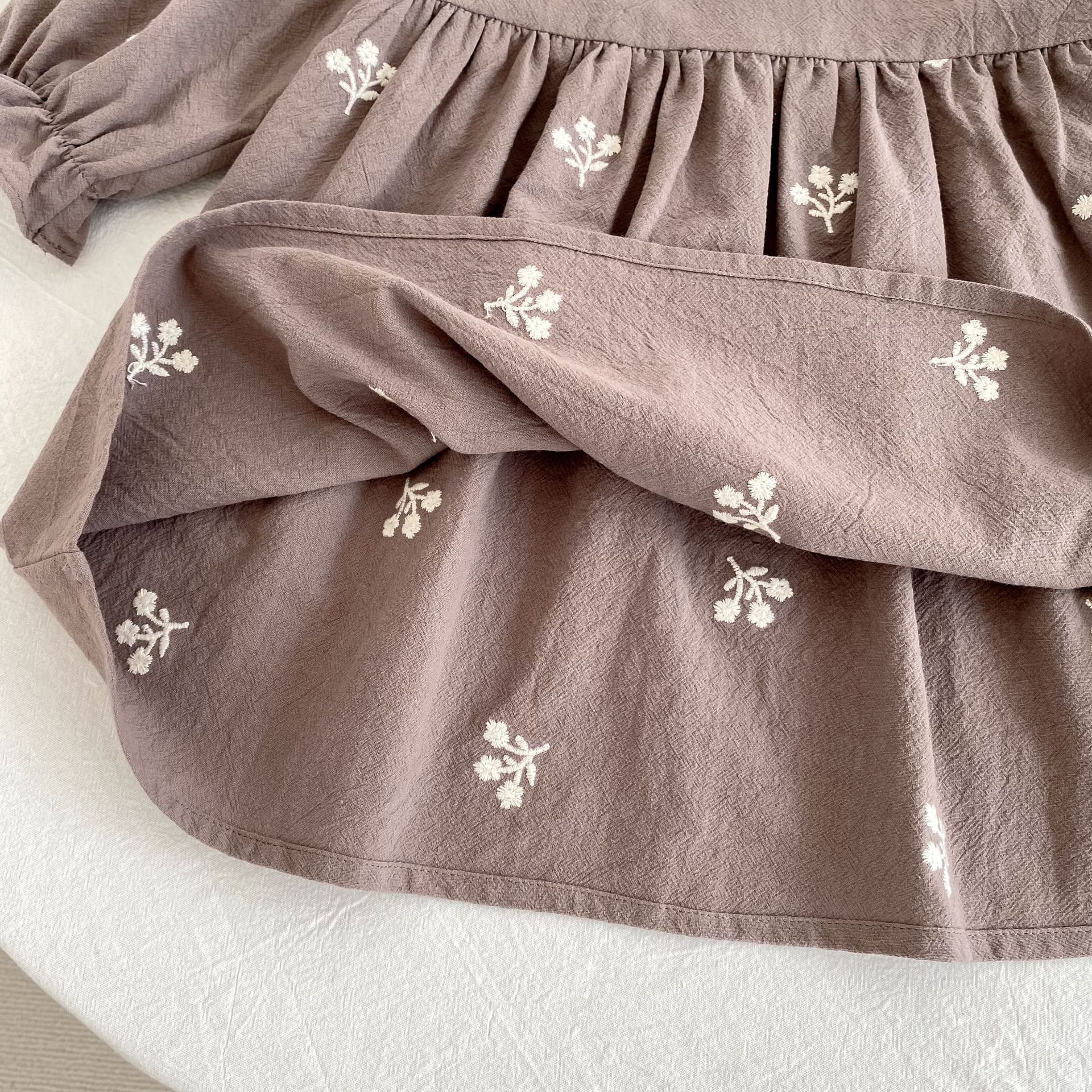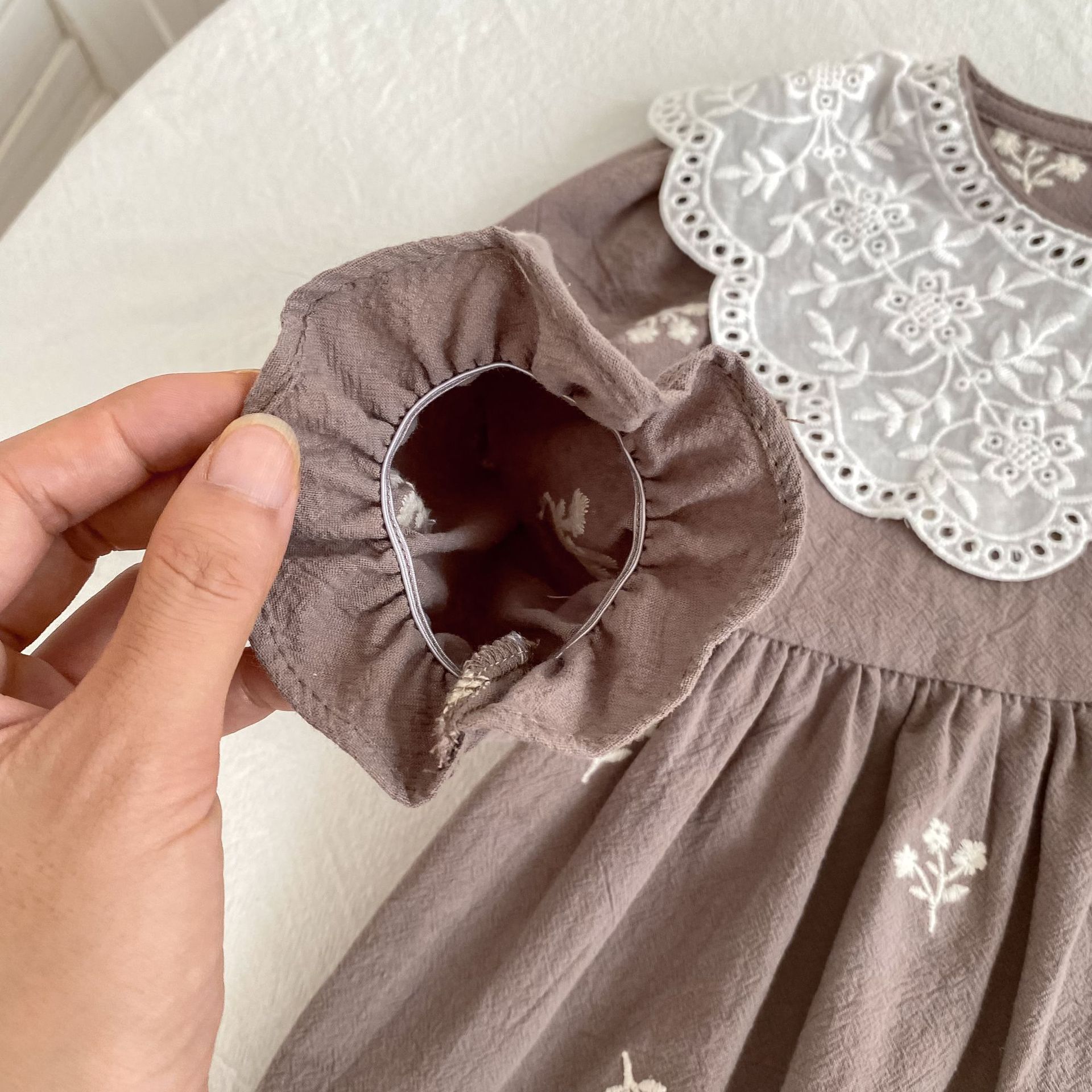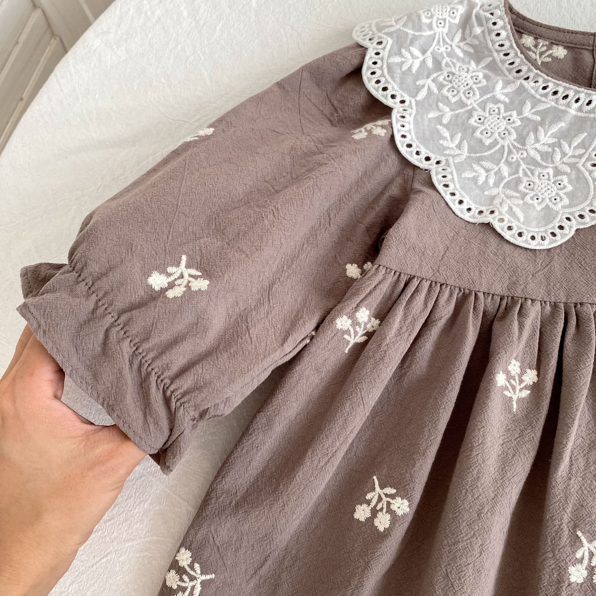 فستان بناتي بتصميم مزين بياقة بدانتيل مطرزة وأكمام طويلة، مع تطريزات زهور رقيقة على القماش القطني