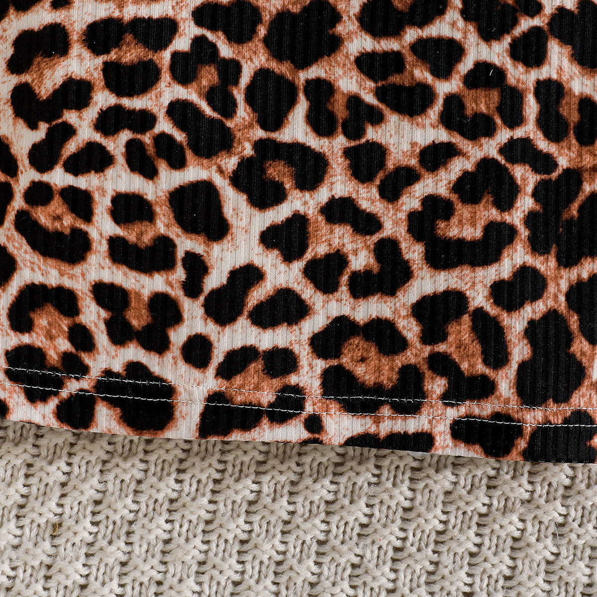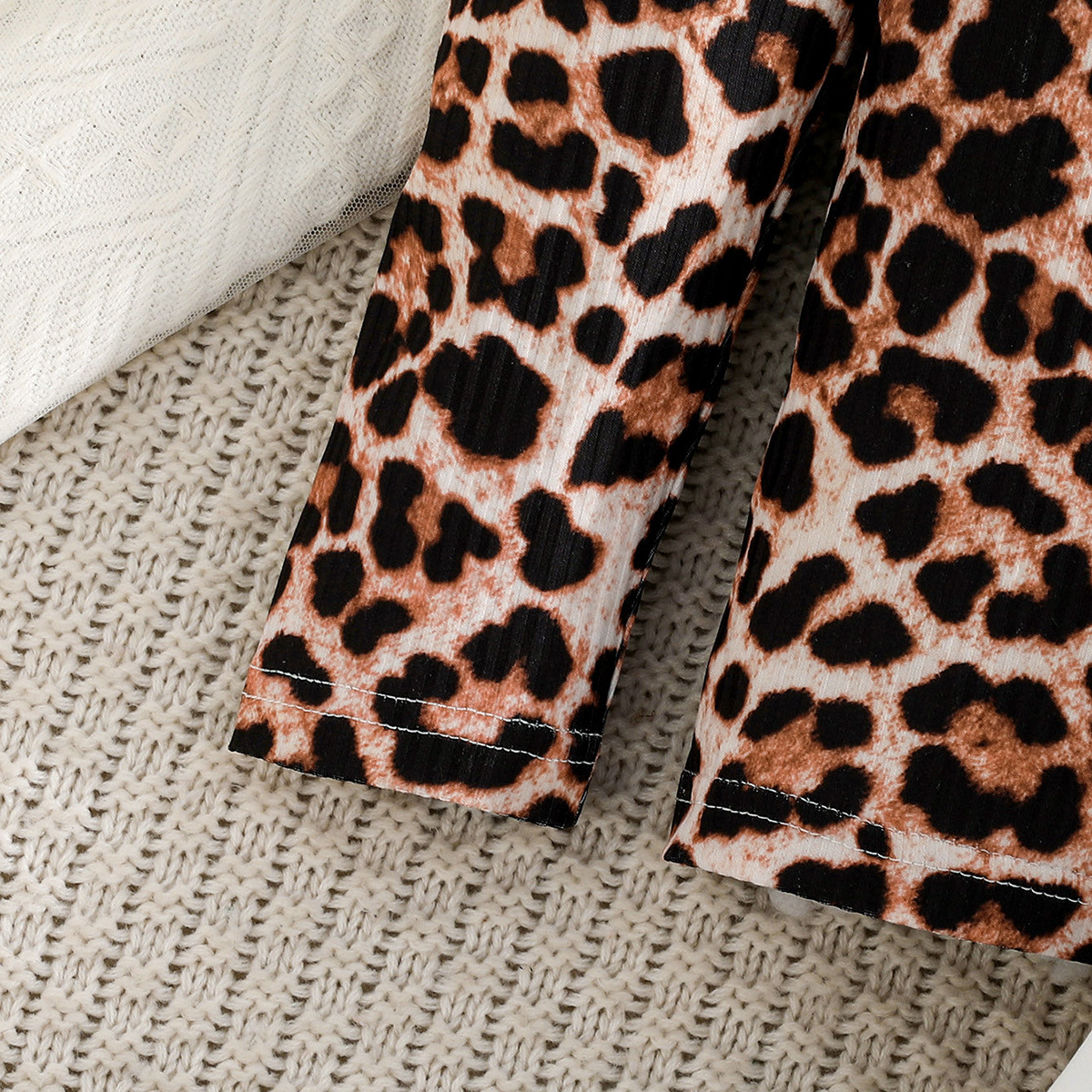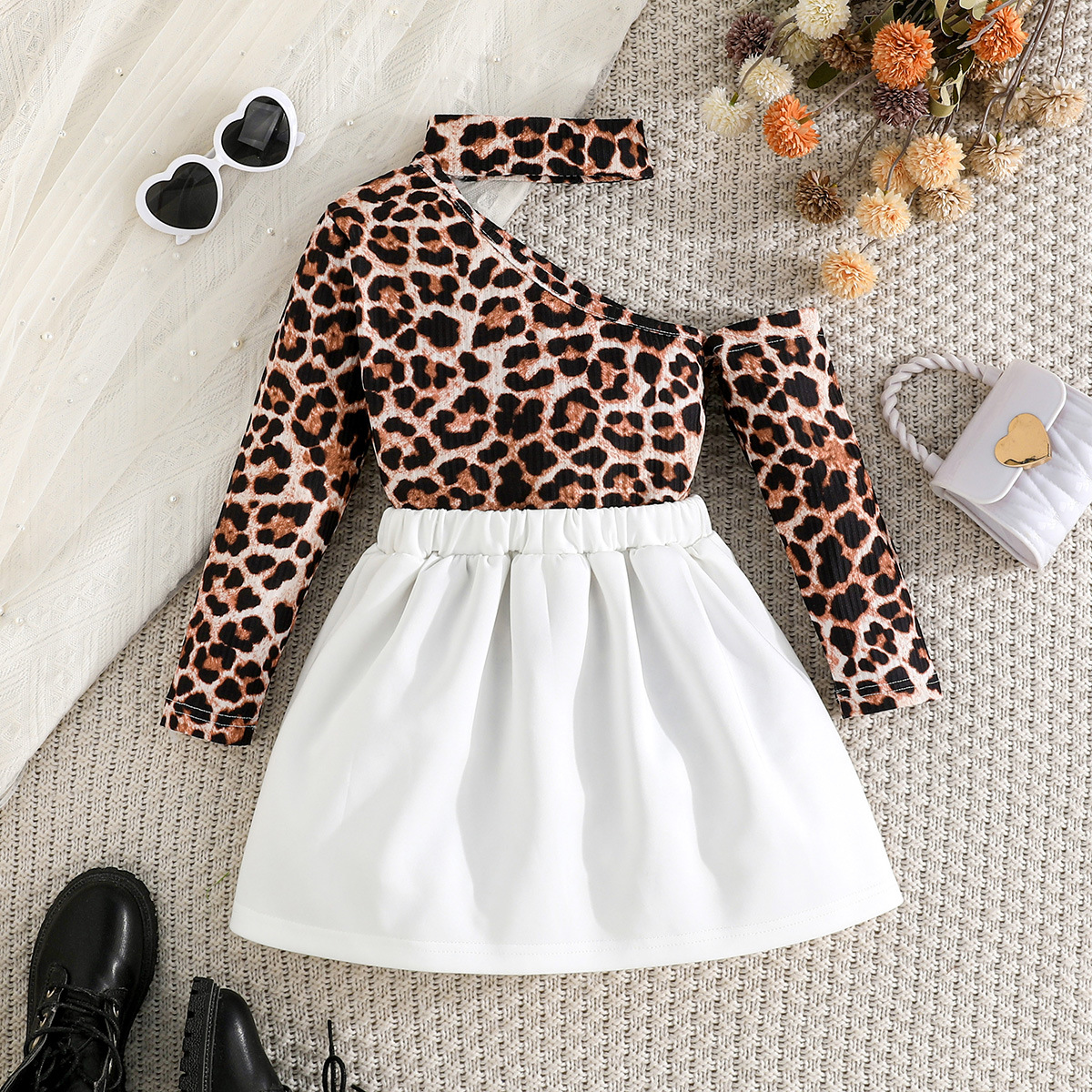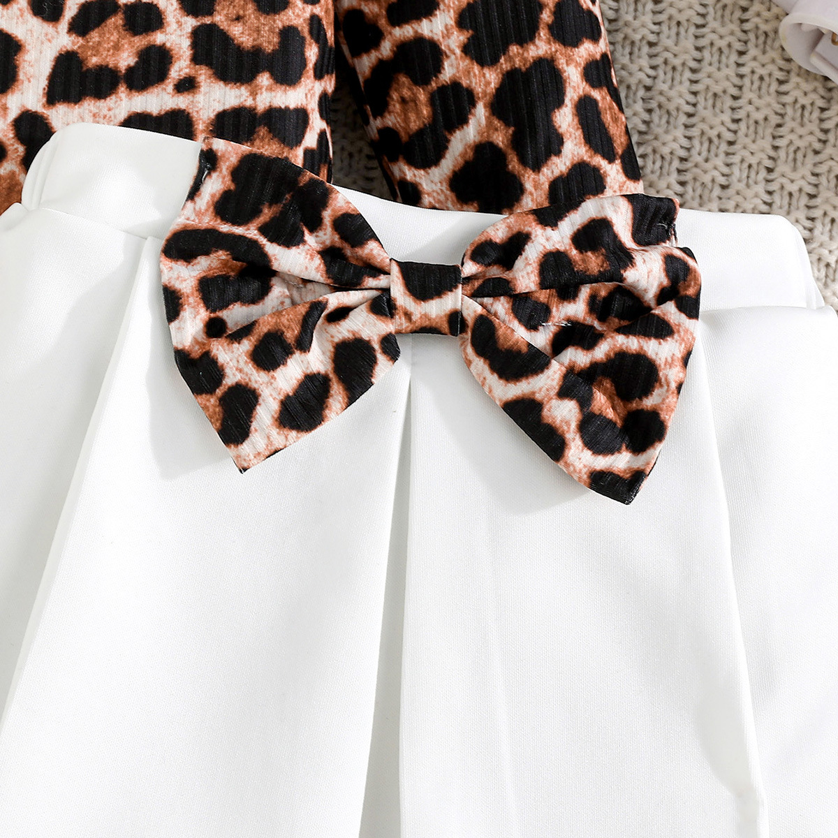 فستان بناتي مكون من قطعتين بأكمام طويلة البلوزة المطبوعة بنمط جلد الفهد وتنورة بخصر مطاطي مزينة بفيونكة كبيرة