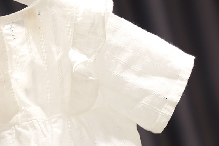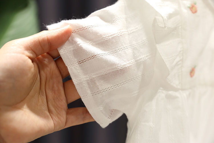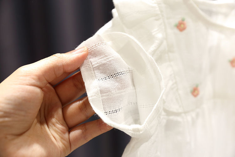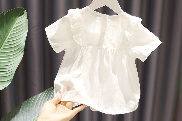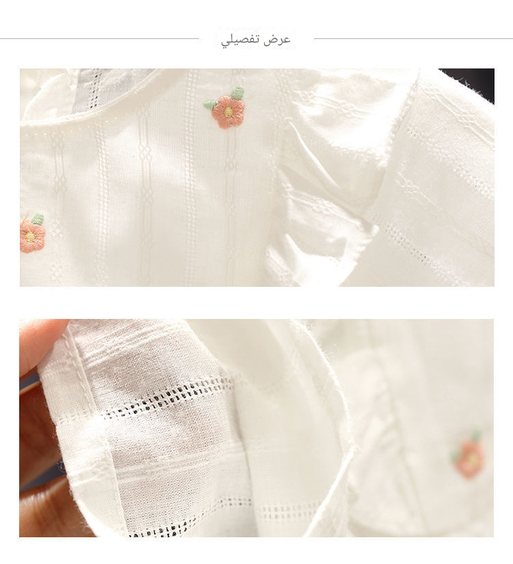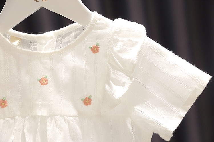 بلوزة تيشيرت أطفال صيفي بأكمام قصيرة، بتصميم مكشكش على الأكتاف وتطريز ورود صغيرة