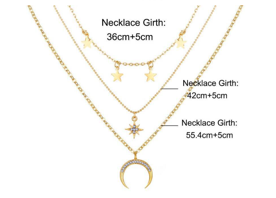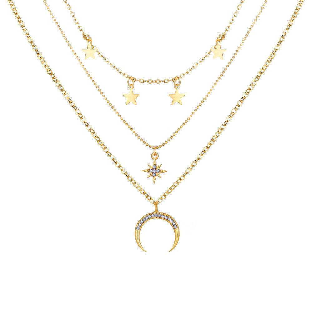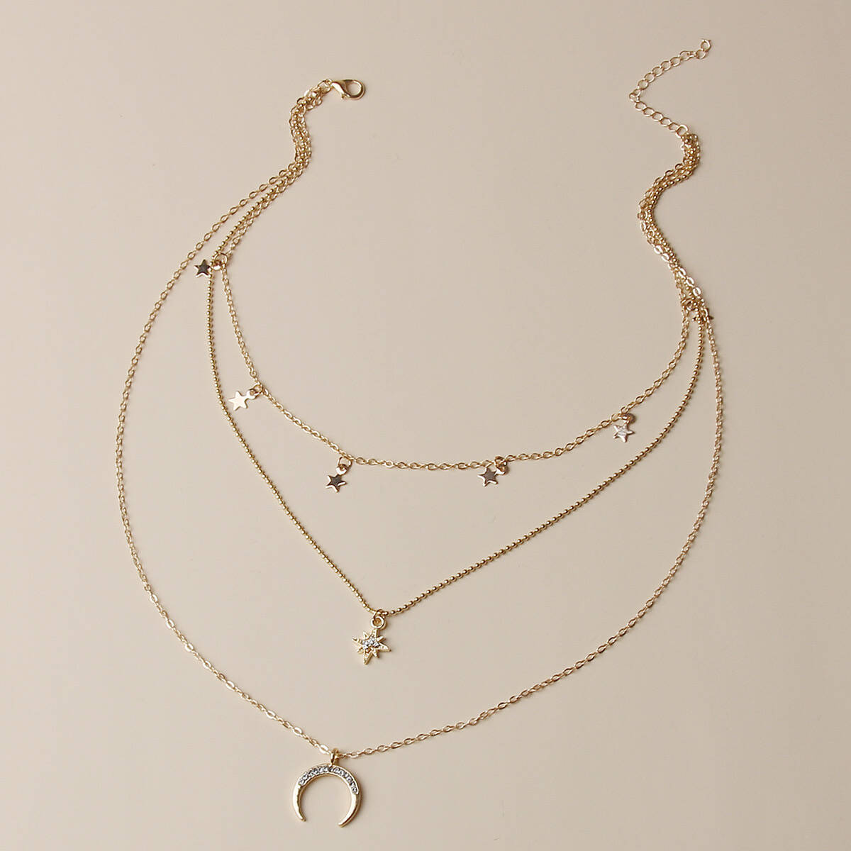 قلادة نسائية متعددة الطبقات باللون الذهبي،مزينة بسلسلة من النجوم المتلألئة وقلادة هلال