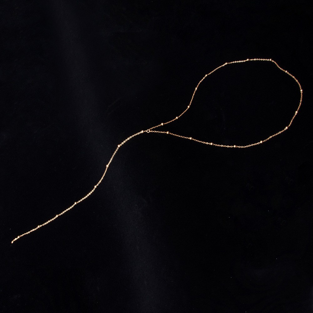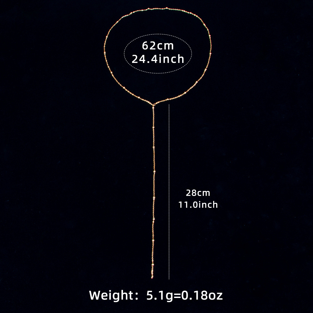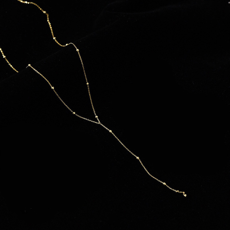 قلادة نسائية بتصميم بسيط على شكل حرف Y، تتميز بسلسلة رفيعة زينة بخرزات صغيرة