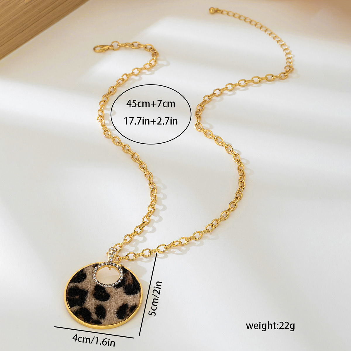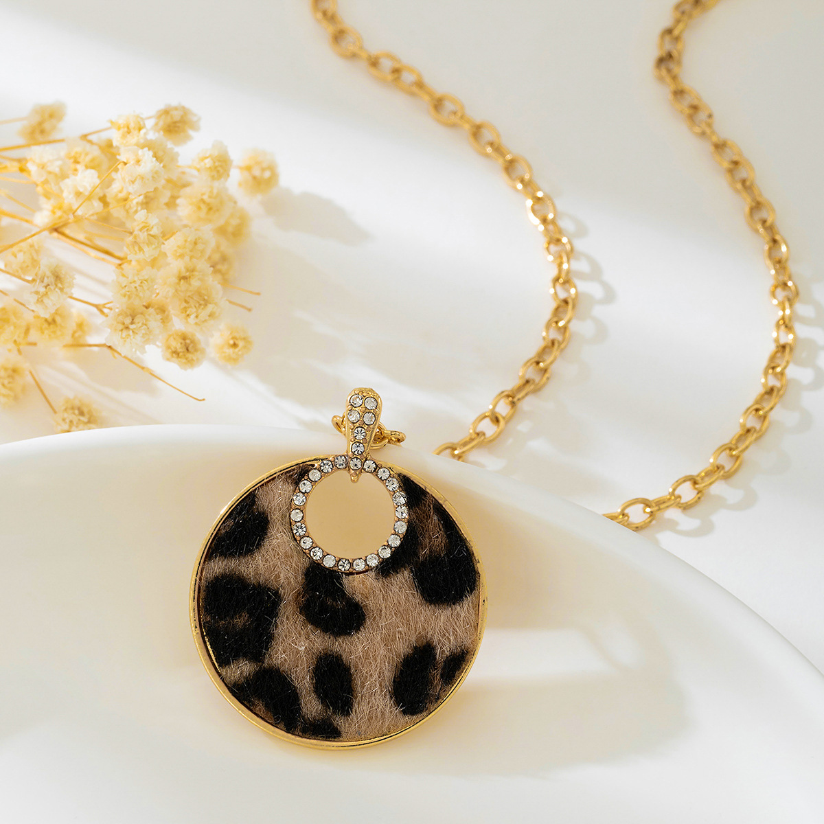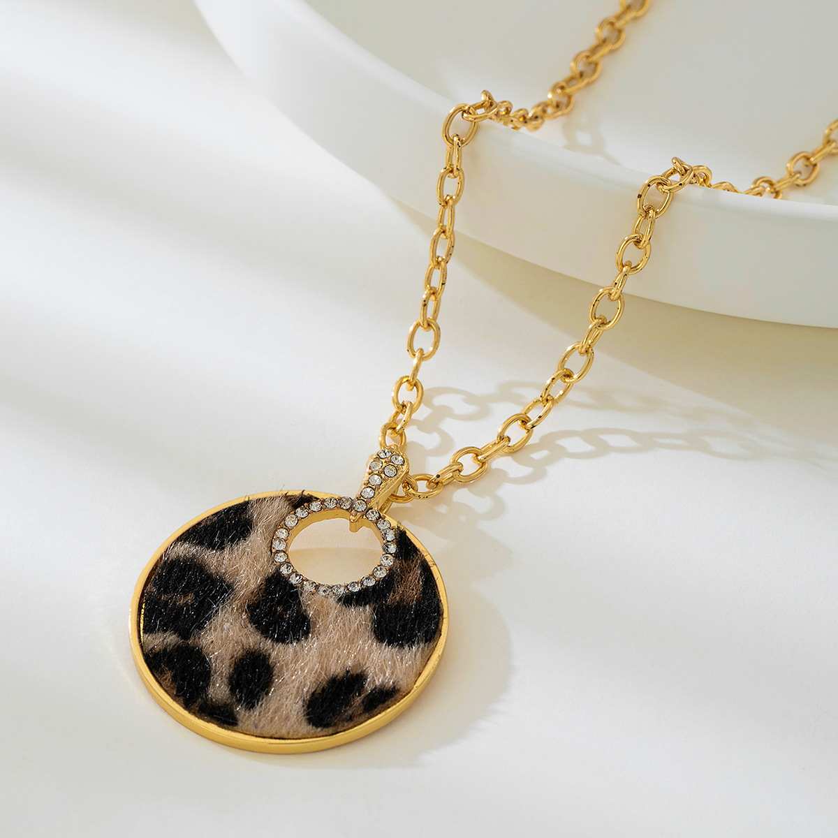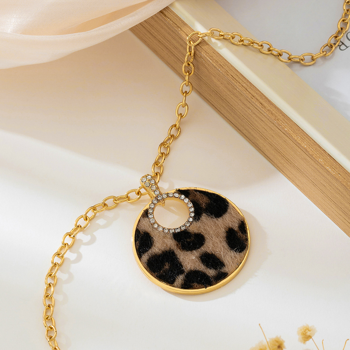 قلادة نسائية عصرية بتصميم فريد، تتميز بسلسلة ذهبية سميكة مع تعليقة دائرية كبيرة بنقشة الفهد، مزينة بحلقة داخلية لامعة
