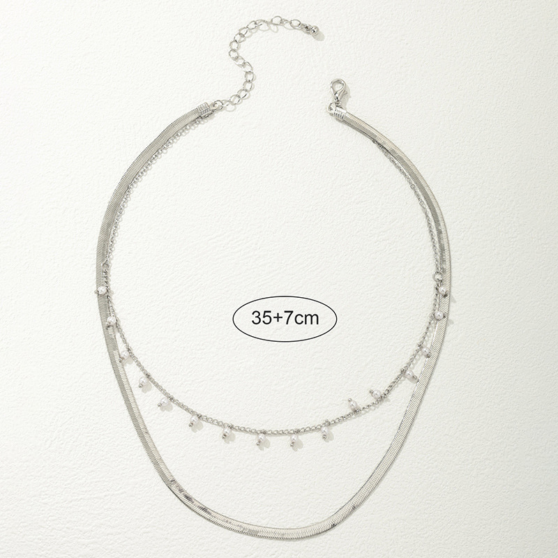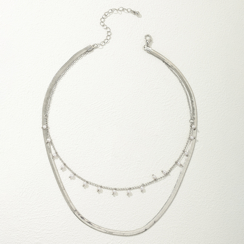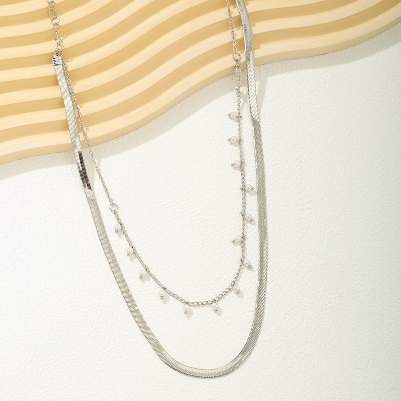 قلادة نسائية عصرية متعددة الطبقات تتميز بتصميم فريد يجمع بين سلسلة مسطحة وعريضة على شكل ثعبان وسلسلة رفيعة مزينة بحبات لؤلؤية صغيرة متدلية