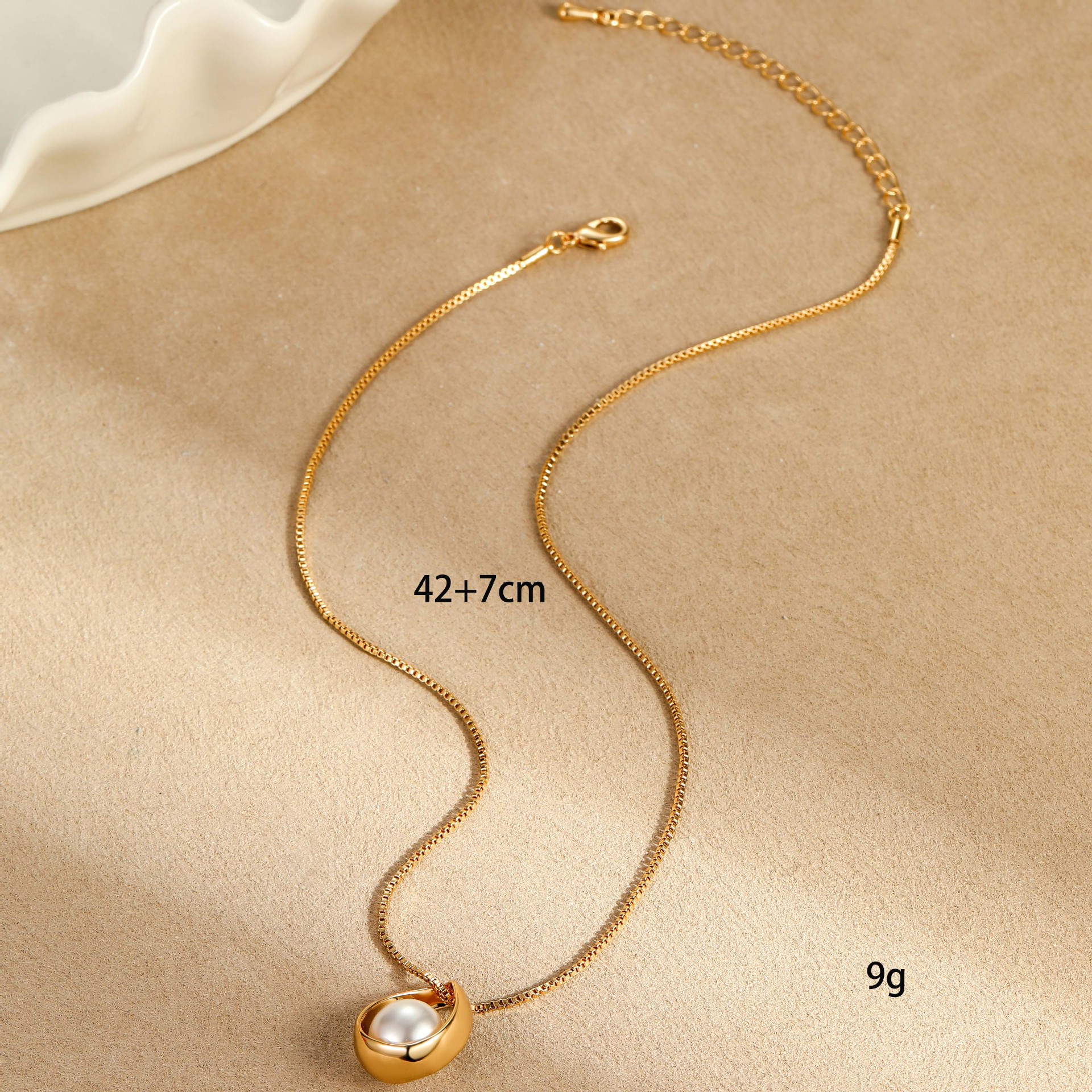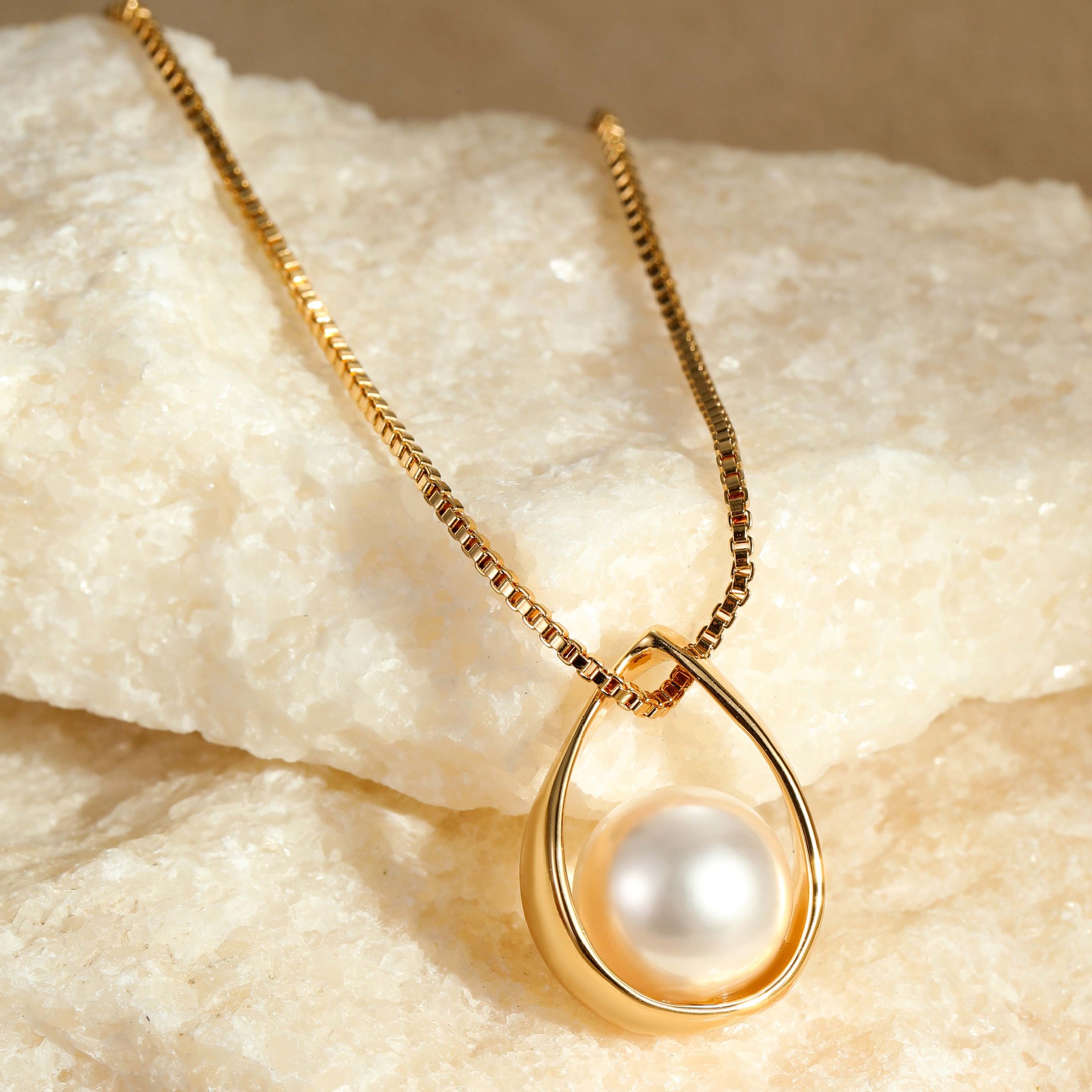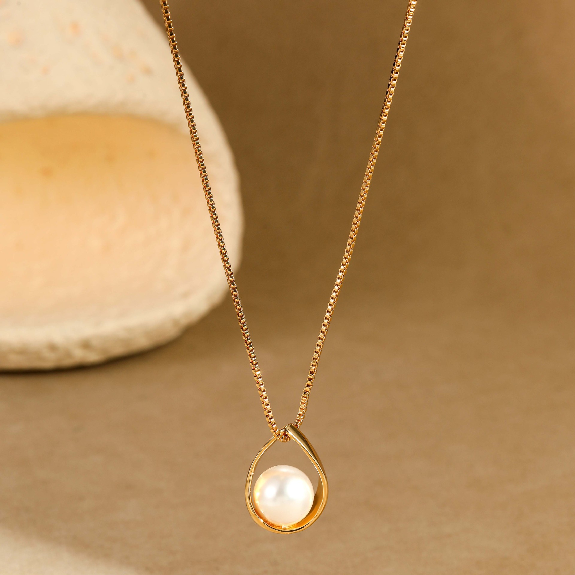 قلادة نسائية أنيقة باللون الذهبي، تتميز بتصميم كلاسيكي على شكل دمعة أو قطرة ماء، بداخلها لؤلؤة لامعة