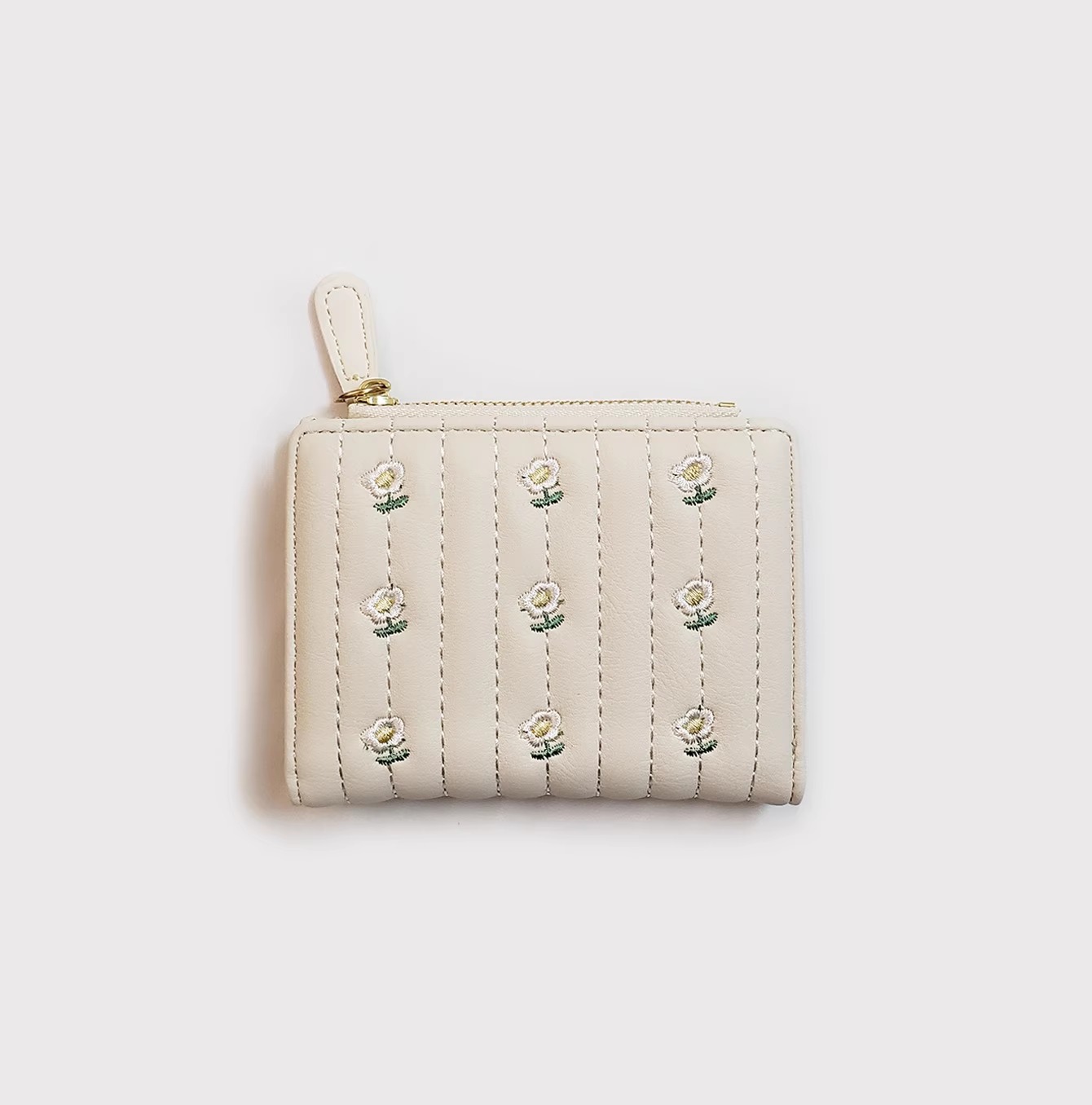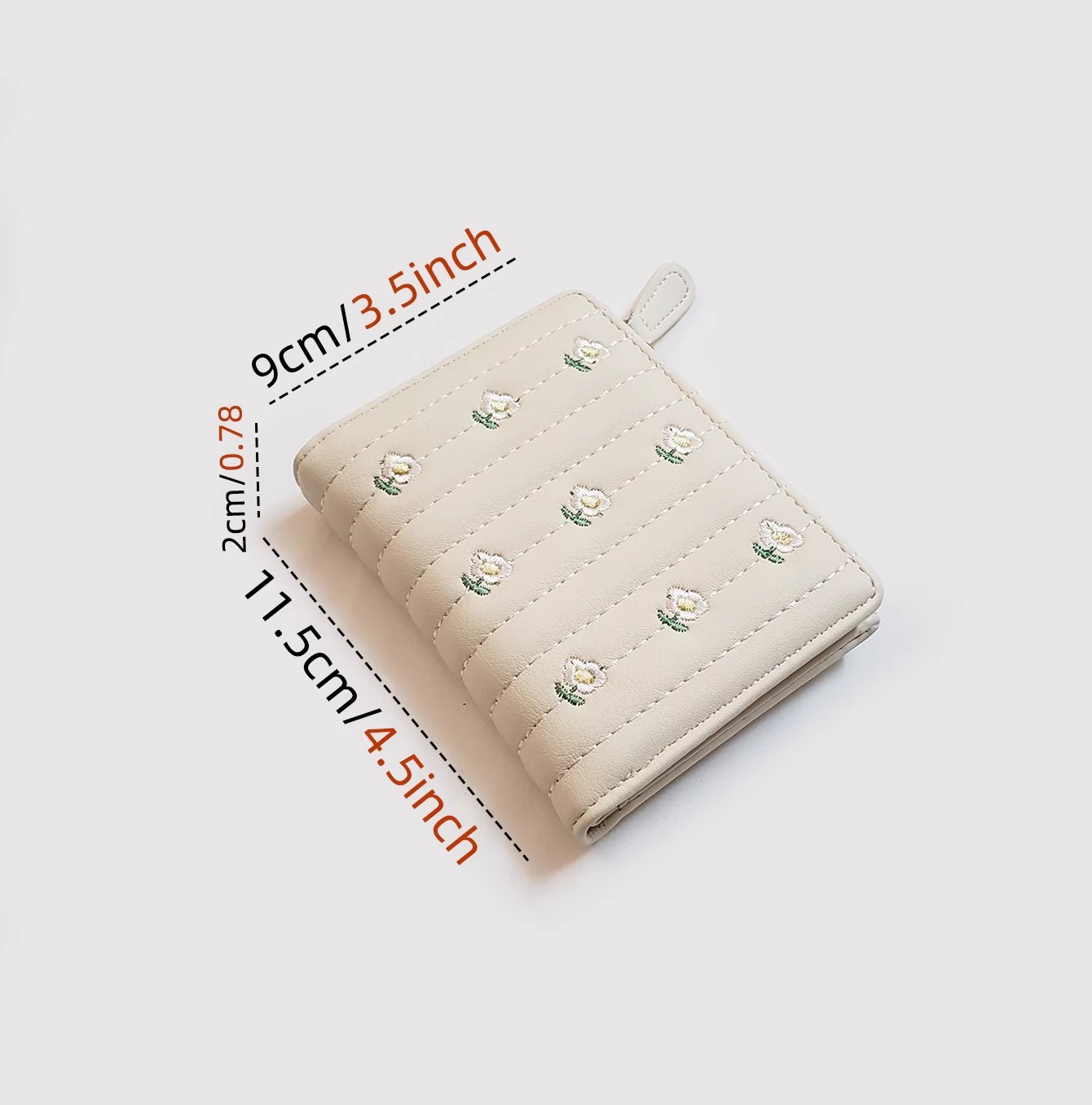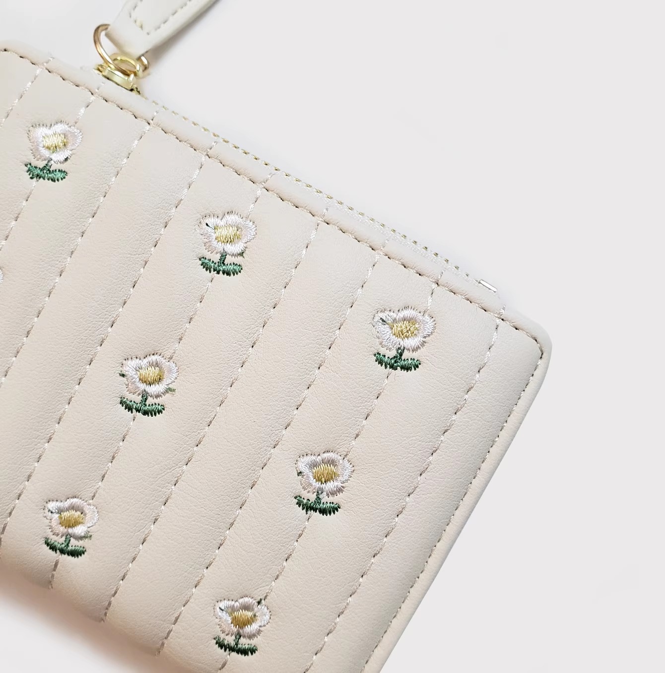 محفظة نسائية صغيرة تتميز بتطريز رقيق على شكل زهور بيضاء، وتضم مساحات متعددة