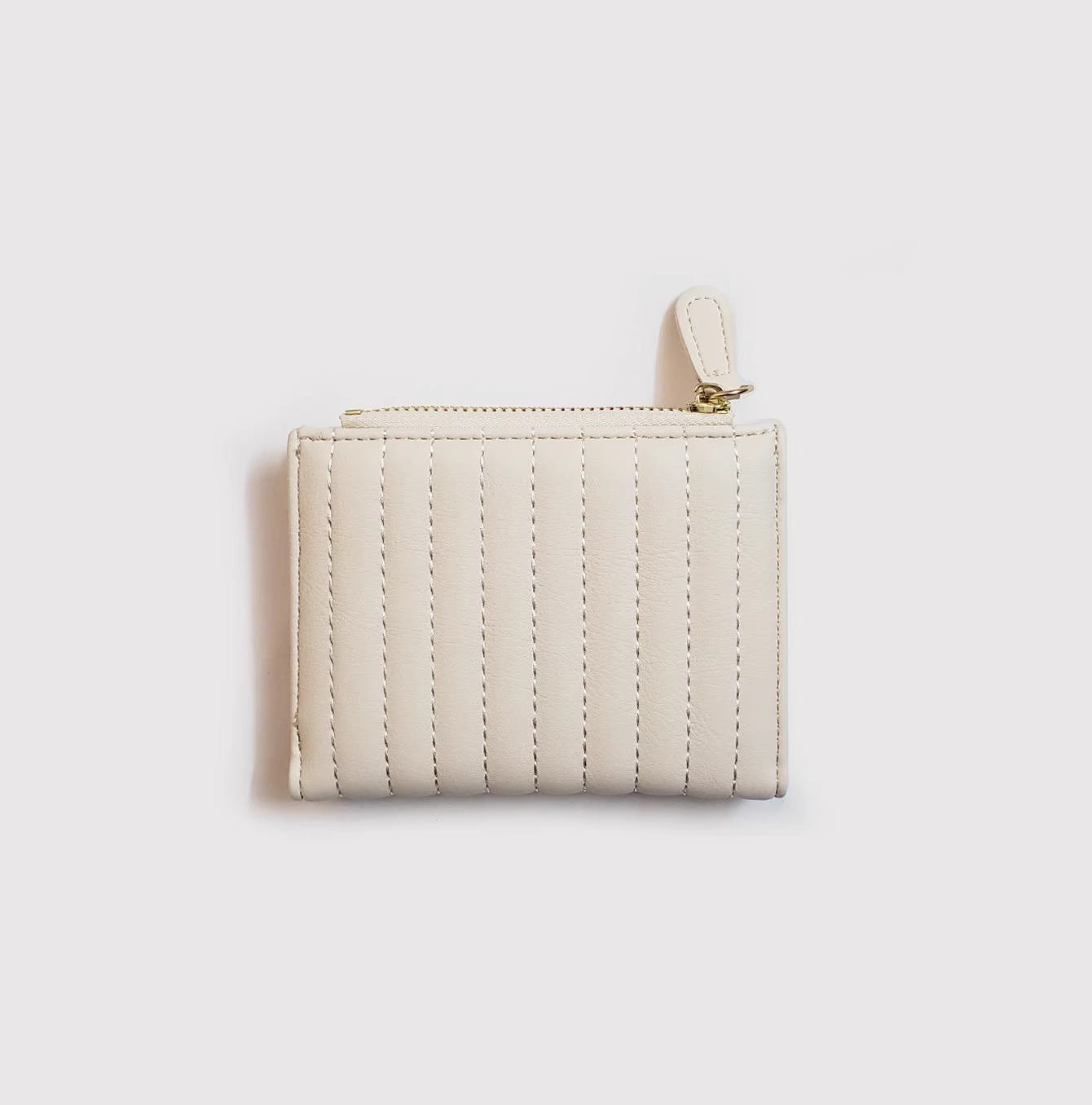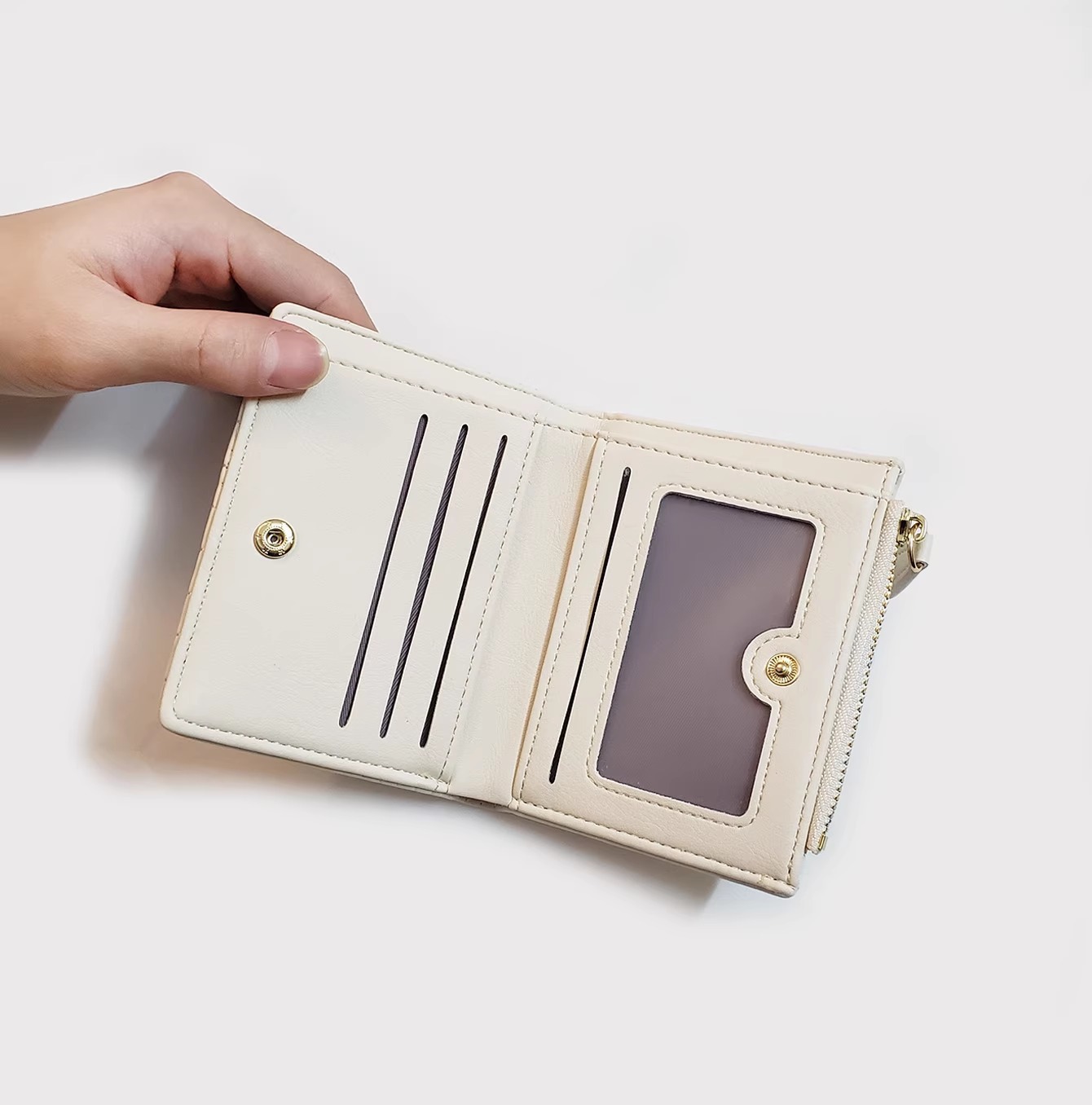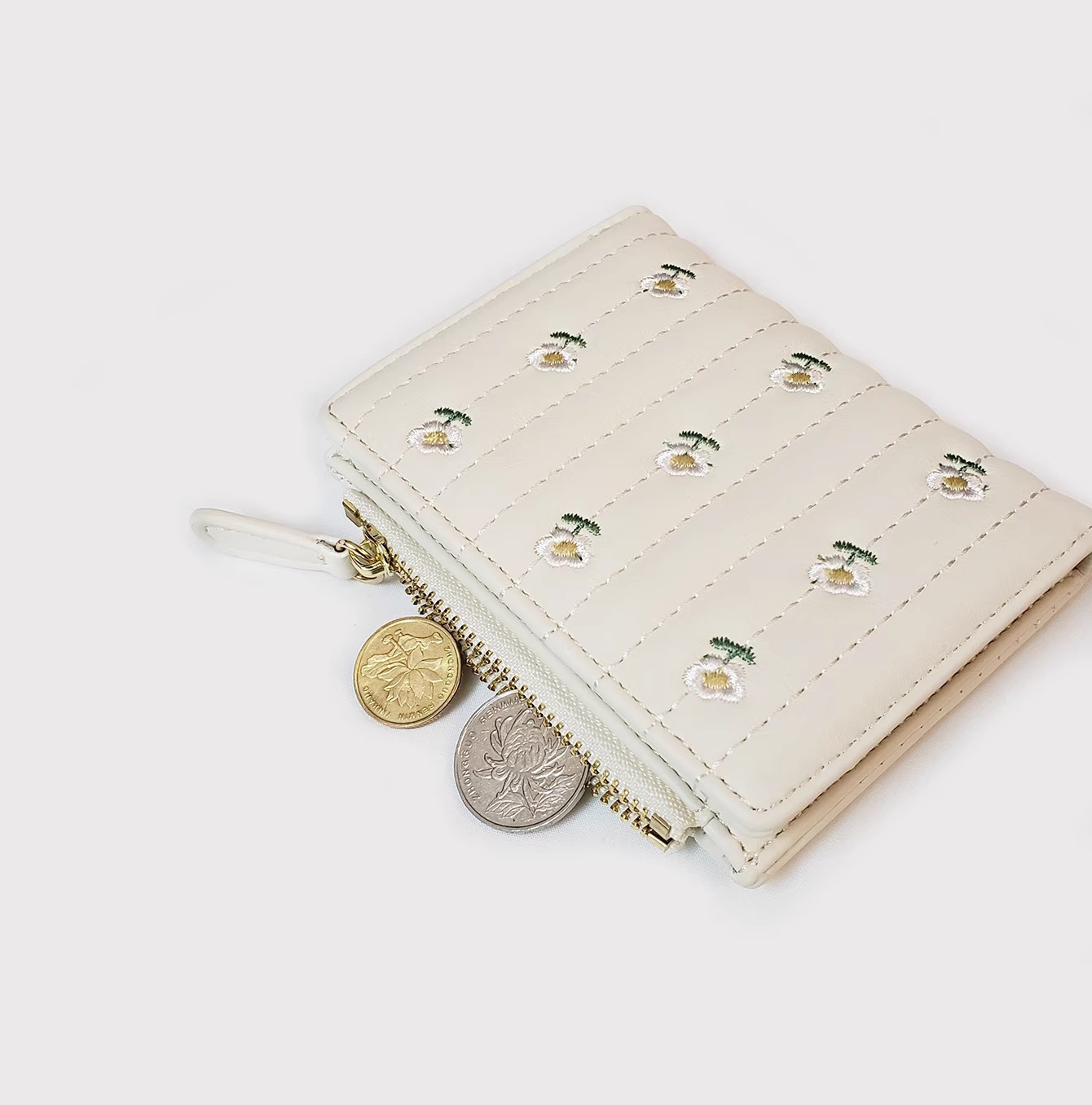 محفظة نسائية صغيرة تتميز بتطريز رقيق على شكل زهور بيضاء، وتضم مساحات متعددة