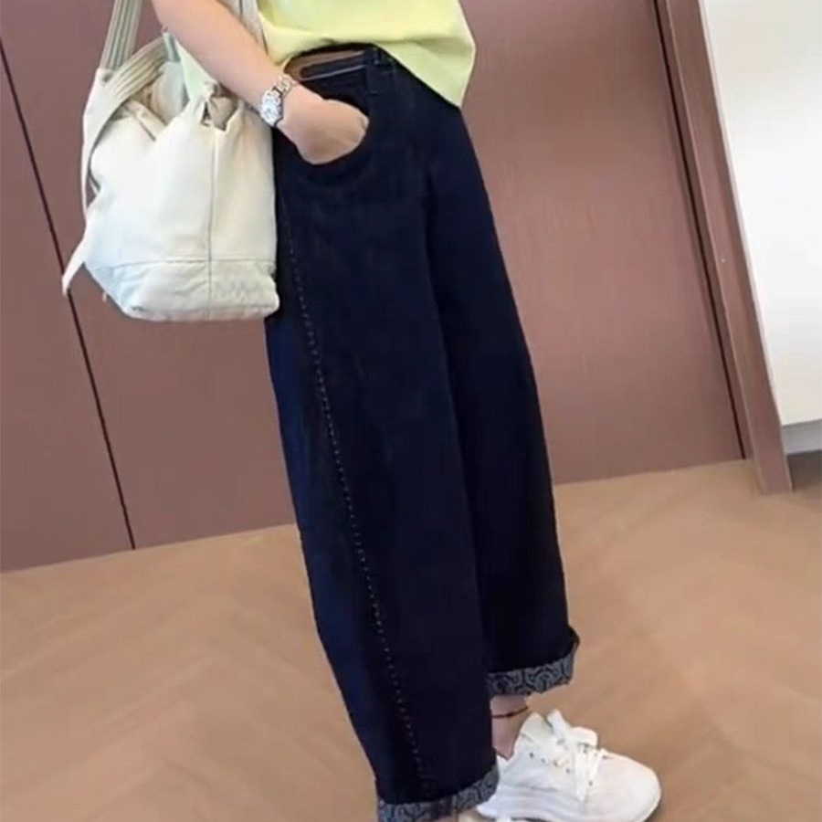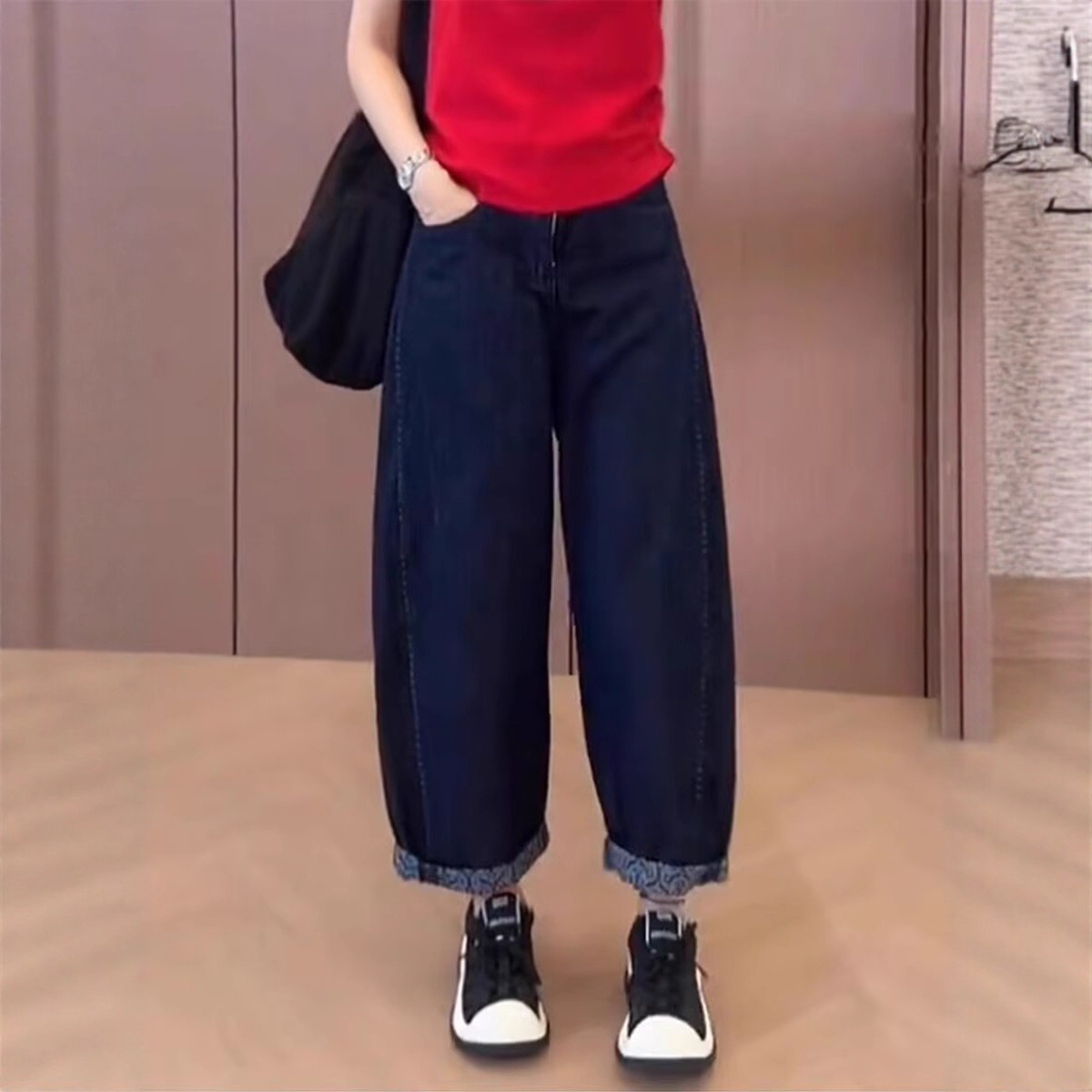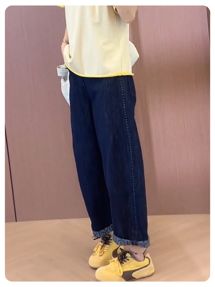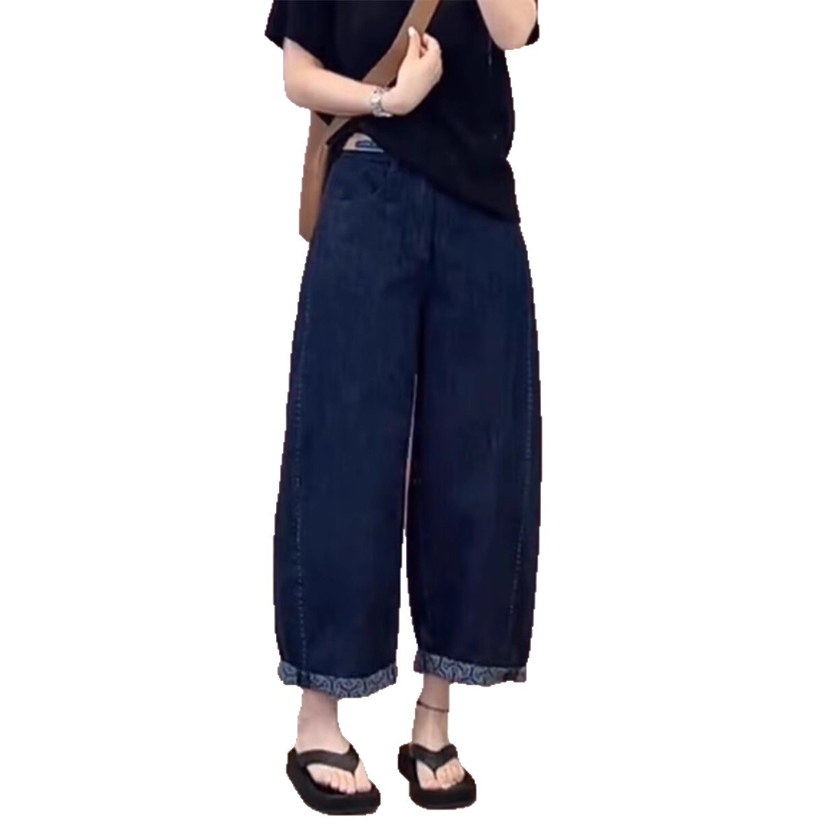 بنطلون جينز نسائي عصري بقصة واسعة وفضفاضة، بتفاصيل مطبوعة على الحافة