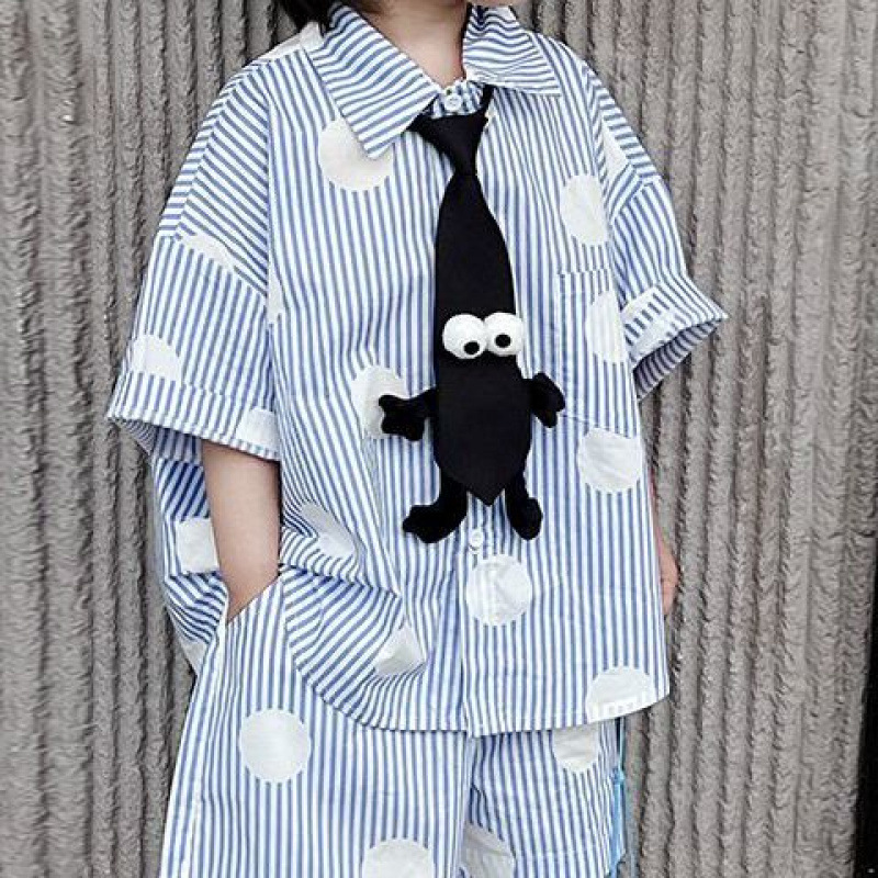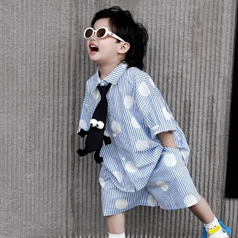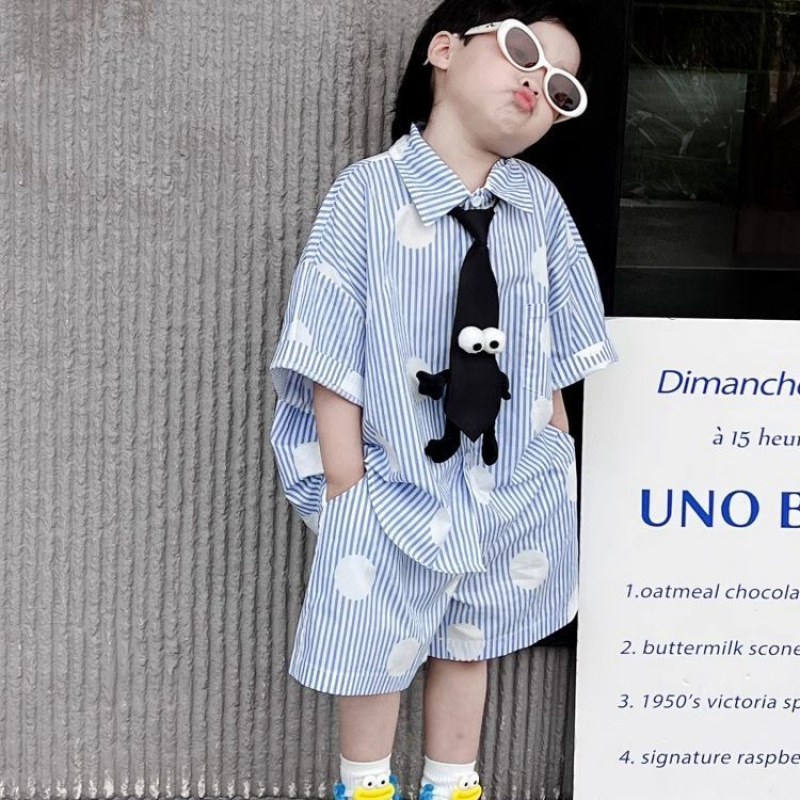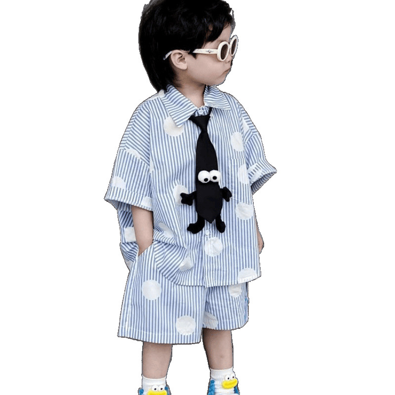 طقم ولادي من قطعتين بتصميم مخطط وربطة عنق سوداء مزينة بشكل كرتوني