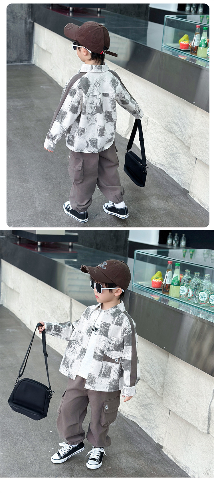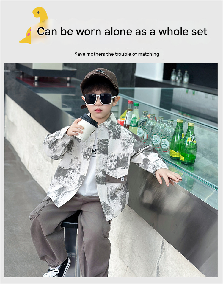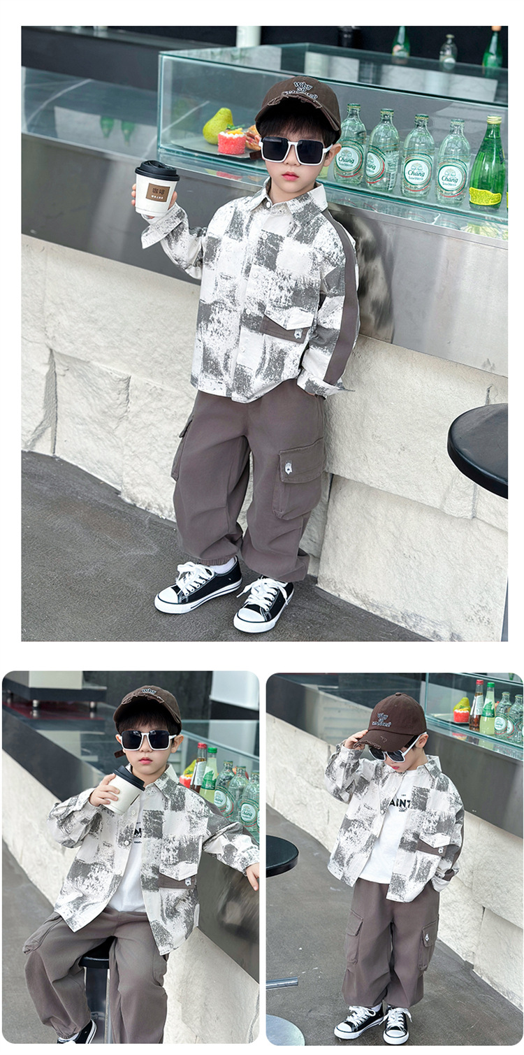 طقم ولادي يتميز بقميص عصري بنقشة مربعات عريضة مع جيوب أمامية