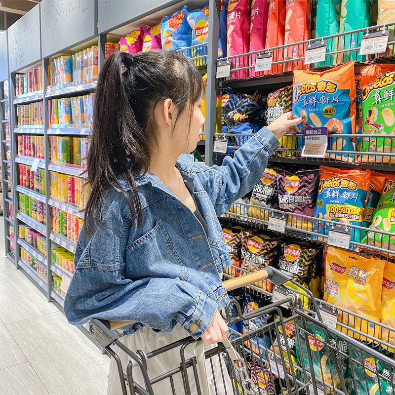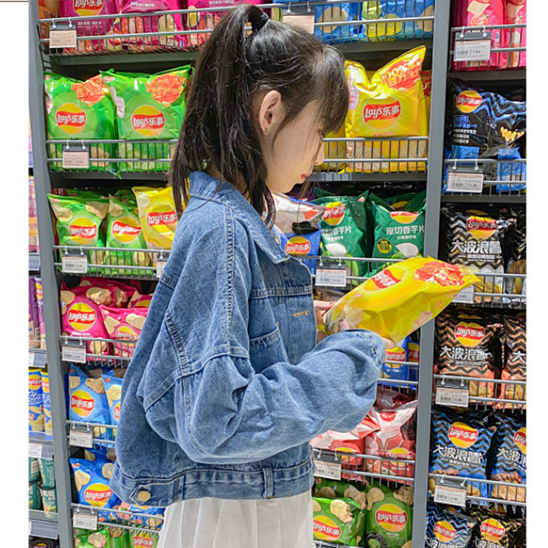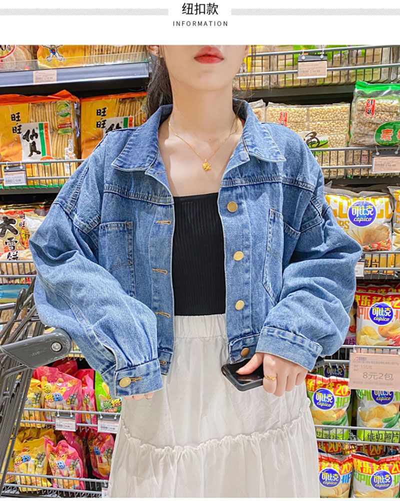 جاكيت جينز نسائي أزرق بقصة قصيرة مع أزرار ذهبية أمامية وخلفية