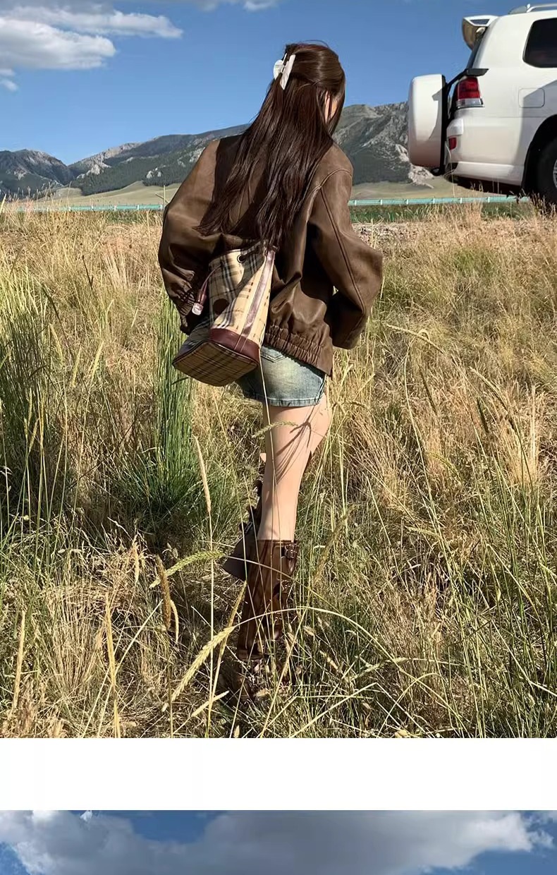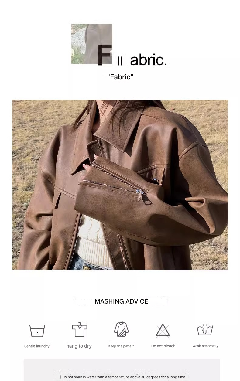 جاكت جلدي قصير وفضفاض بتصميم يتميز بأزرار كبس، وخصر مطاطي، وأكمام منفوخة مع سحاب عند الأطراف