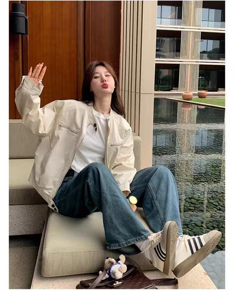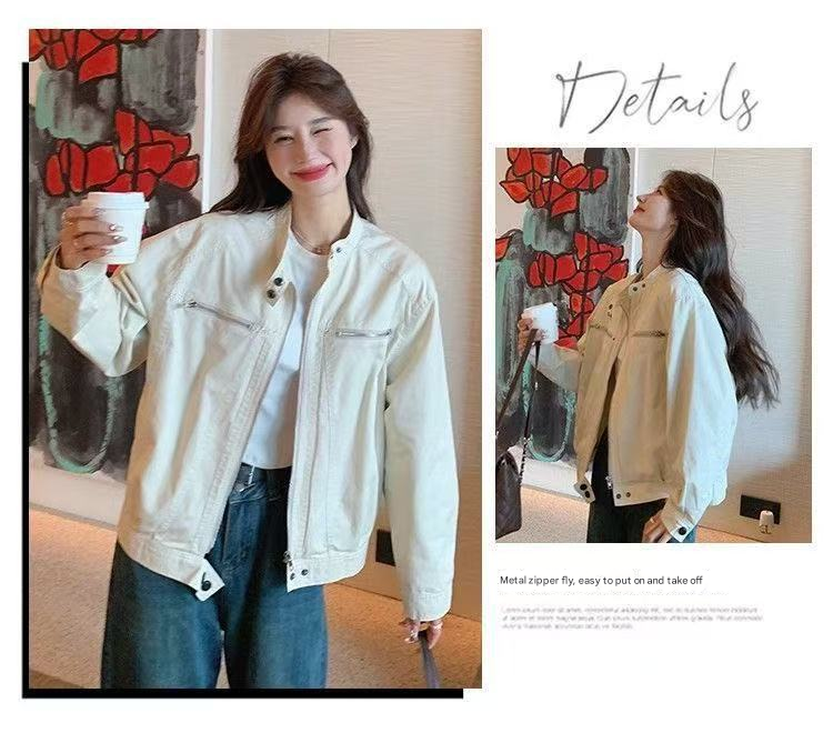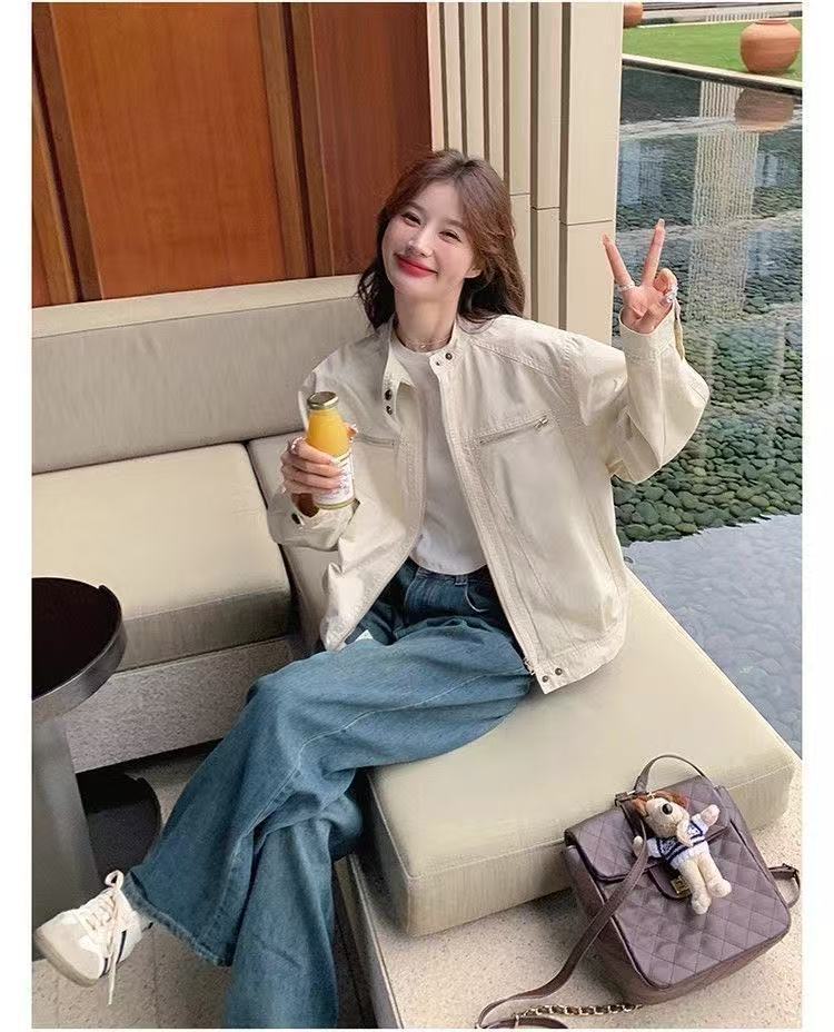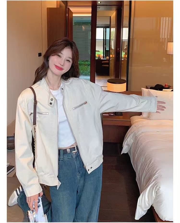 جاكت نسائي بتصميم عصرييتميز بأزرار وجيوب بسحابات فضية على الصدر
