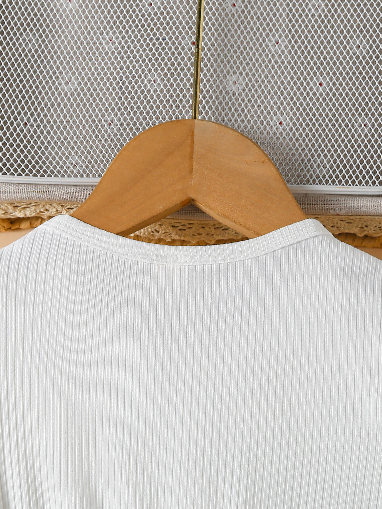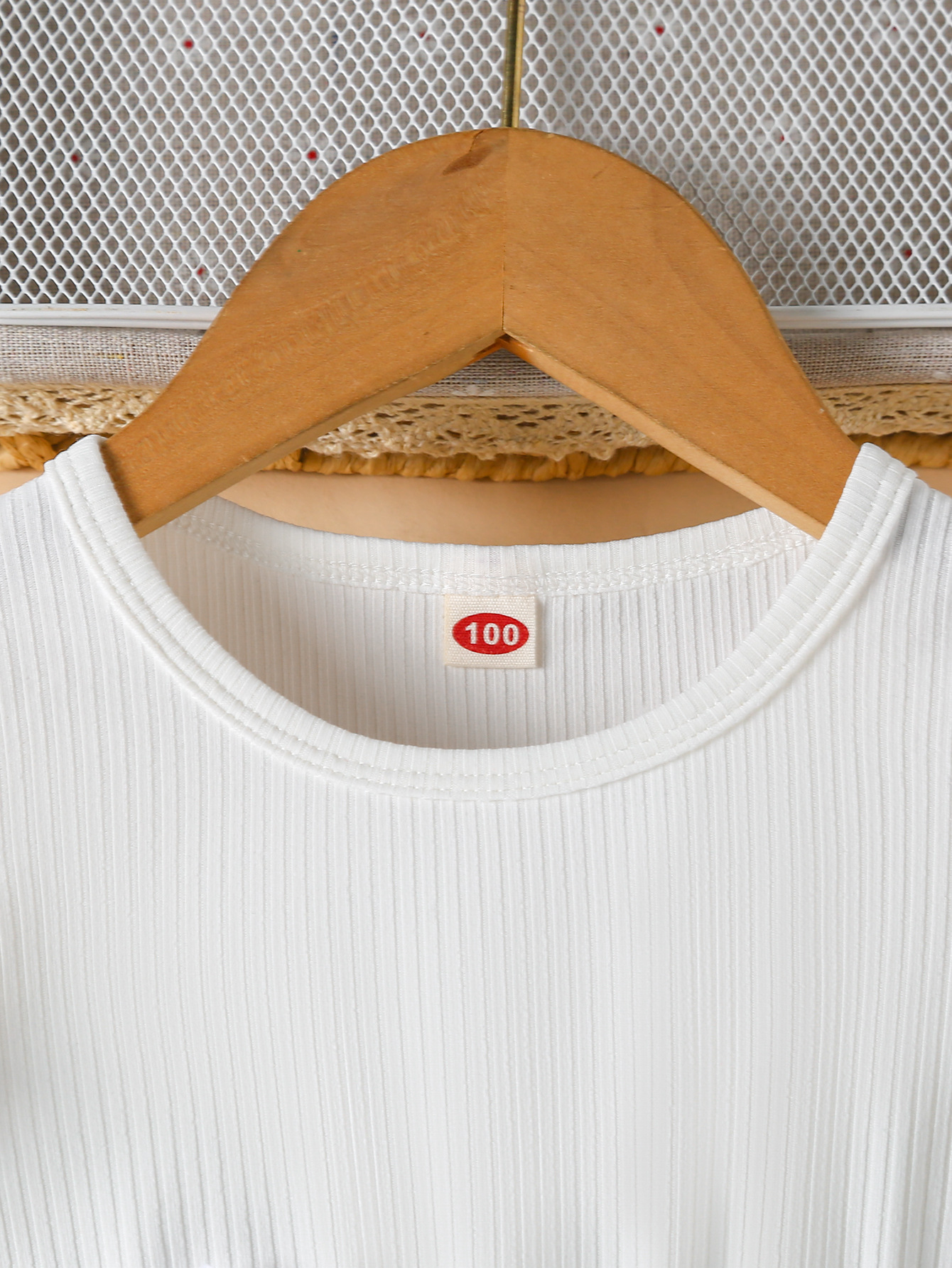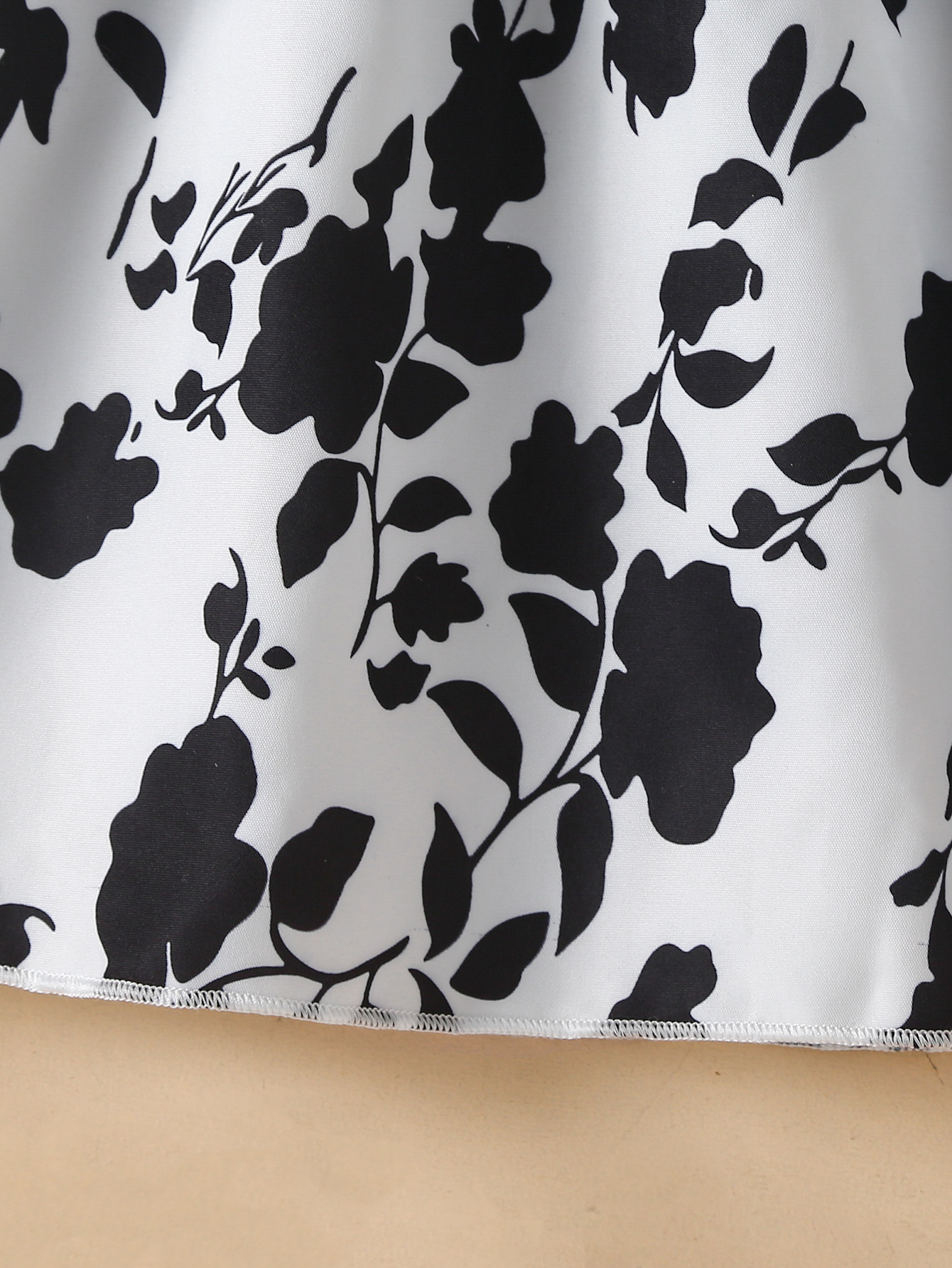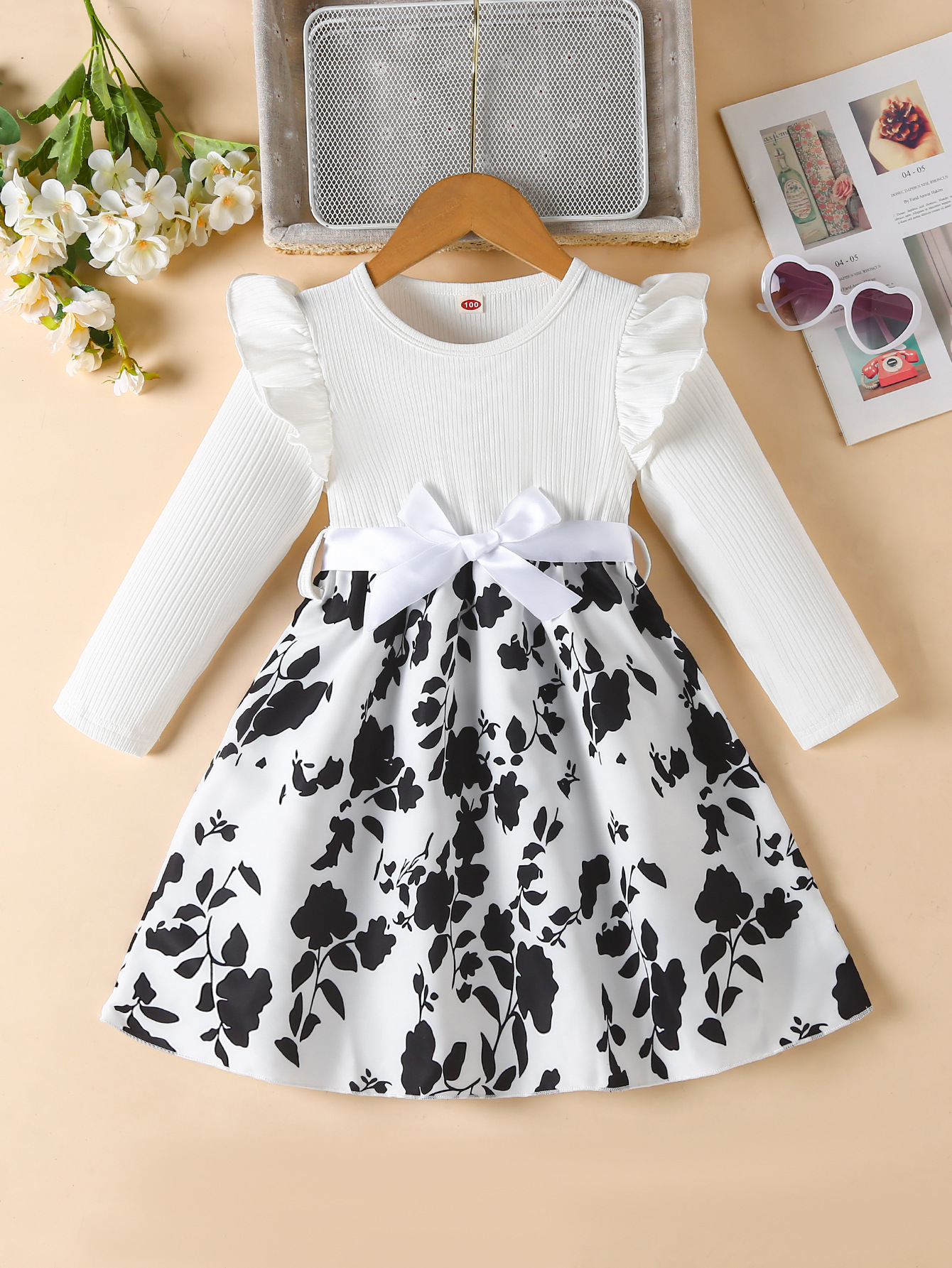 فستان بناتي يتميزبأكمام طويلة مزينة بكشكشة عند الكتفين، مع حزام وفيونكة على الخصر، وتنورة واسعة بنقشة زهور سوداء