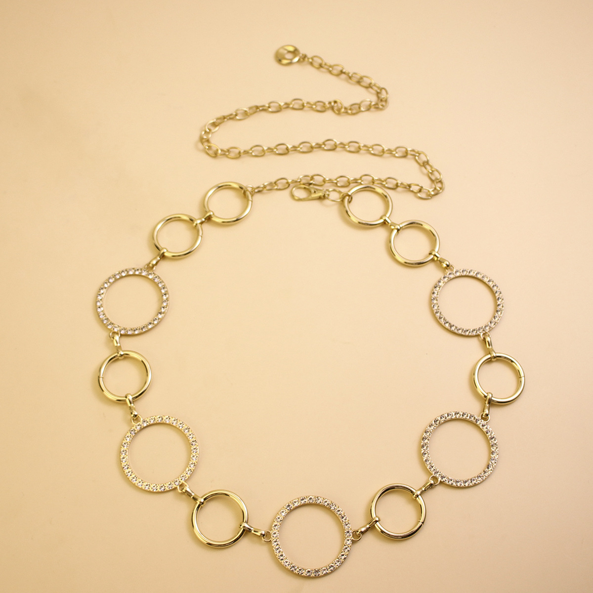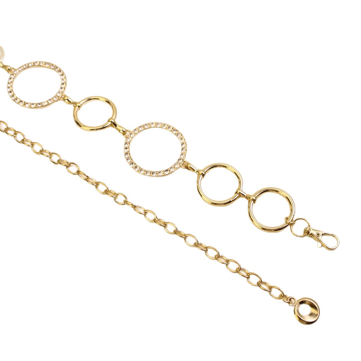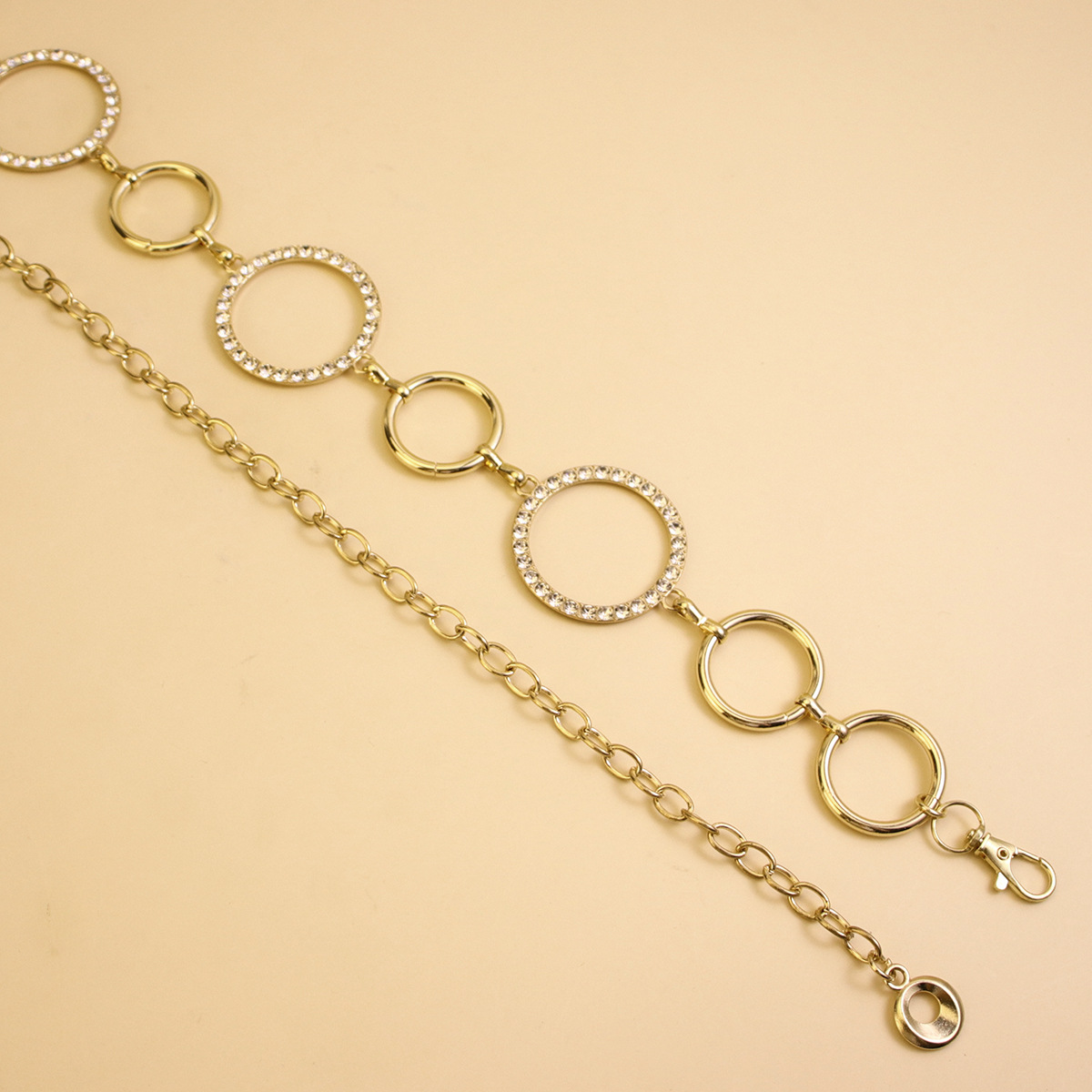 حزام خصر نسائي بسلسلة معدنية تتميز بتصميم حلقات دائرية مزدوجة، مزينة بأحجارلامعة