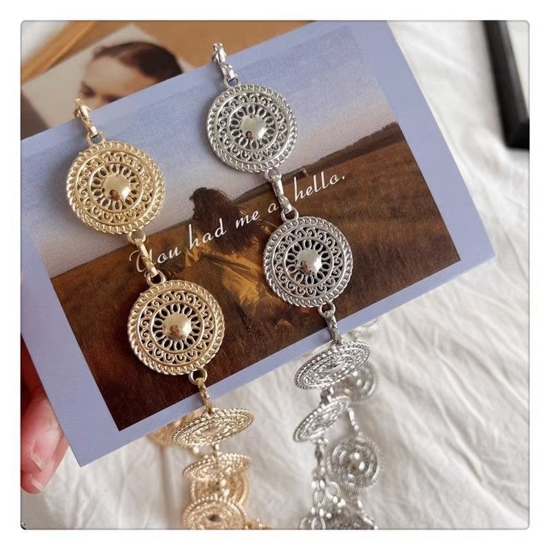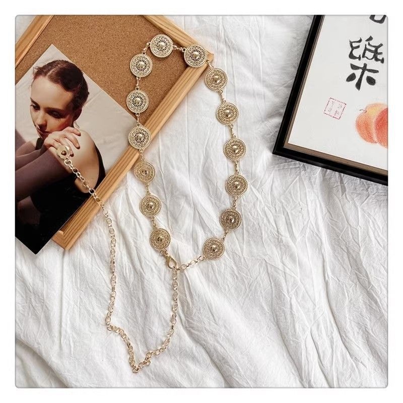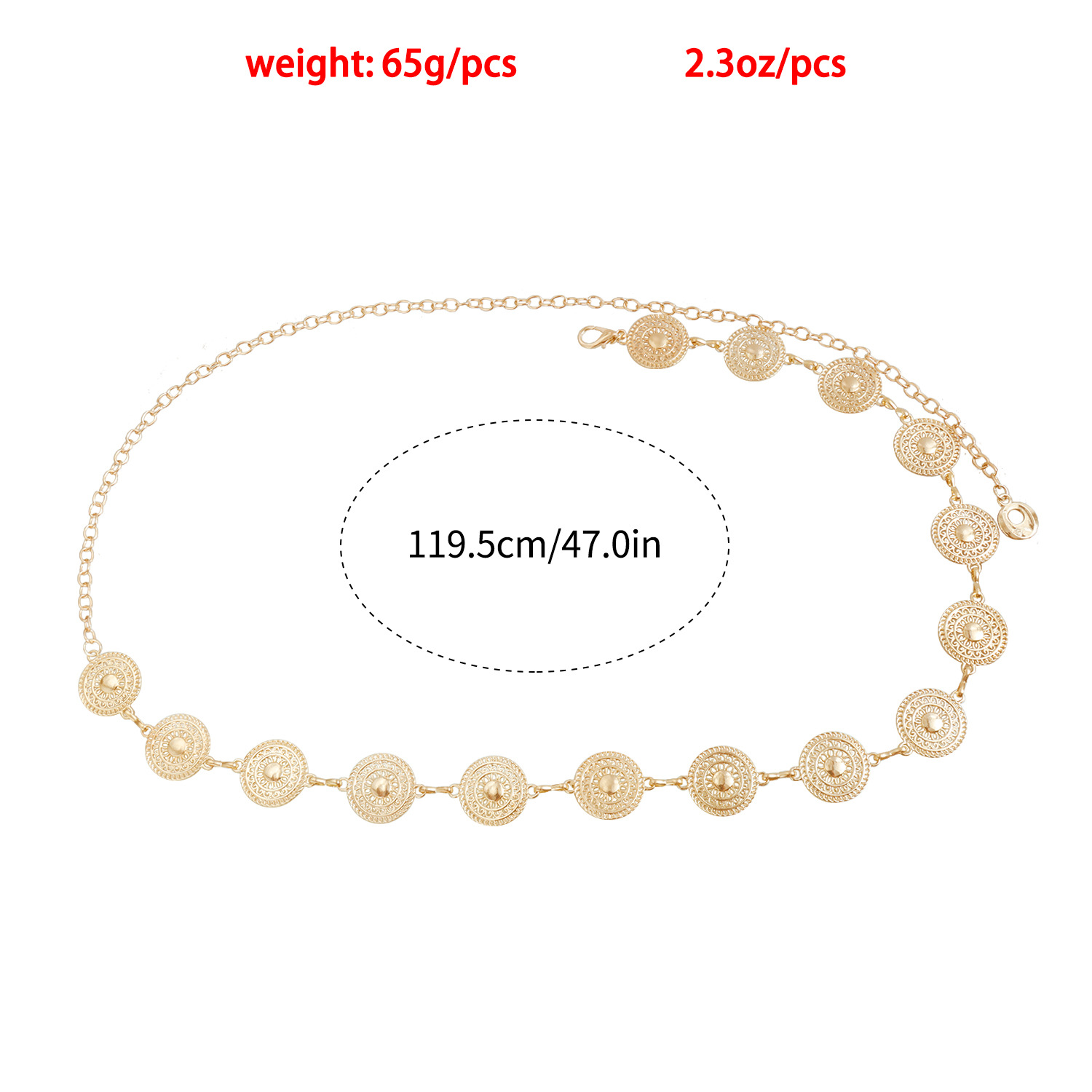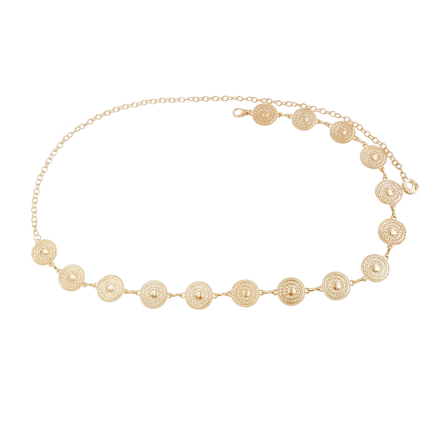 حزام خصرنسائي بسلسلة معدنية بتصميم حلقات دائرية مجوفة، تتميز بنقوش زهرية محفورة، قابل للتعديل مع سلسلة متدلية