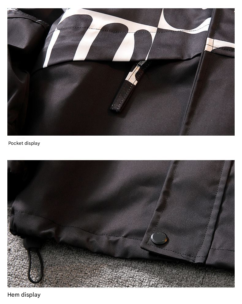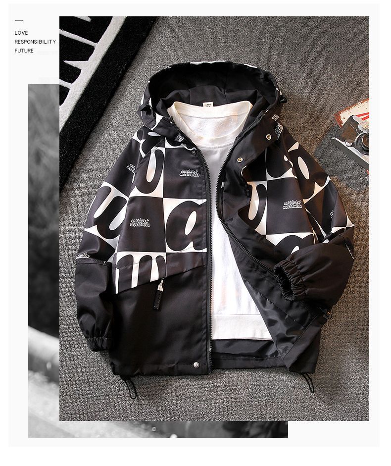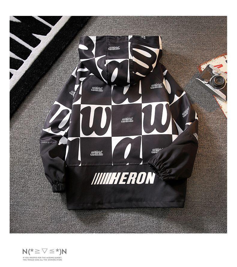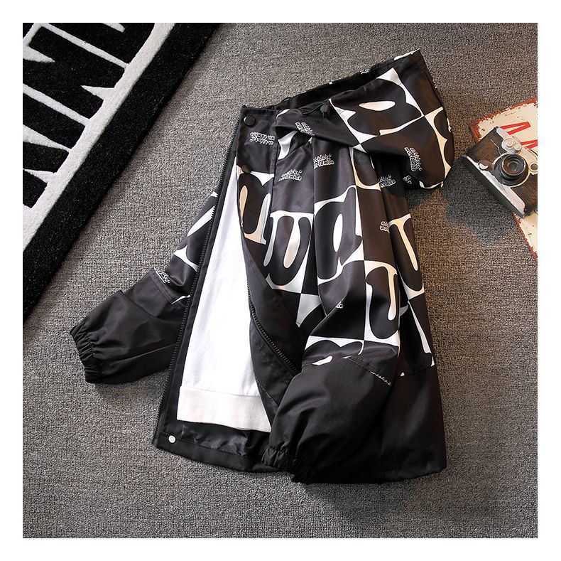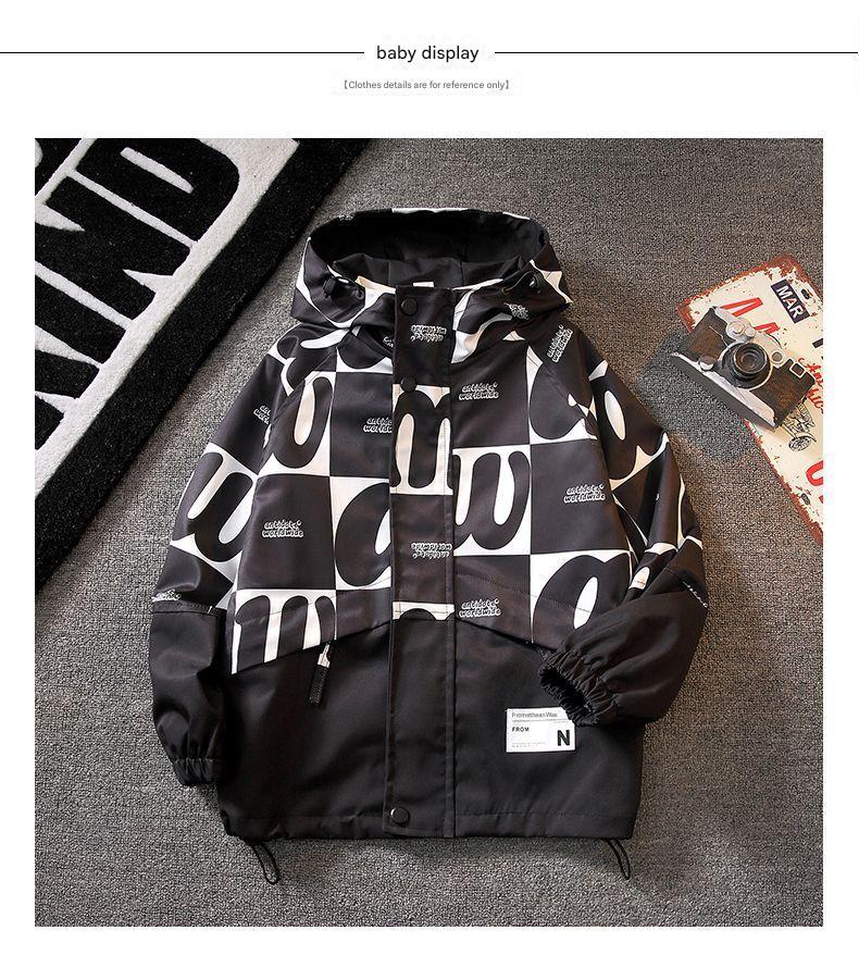 جاكت ولادي يتميز بتصميمة المكون من مربعات بيضاء وسوداء مع حروف كبيرة مطبوعة، ويأتي برباط عند الحافة السفلية لضبط المقاس