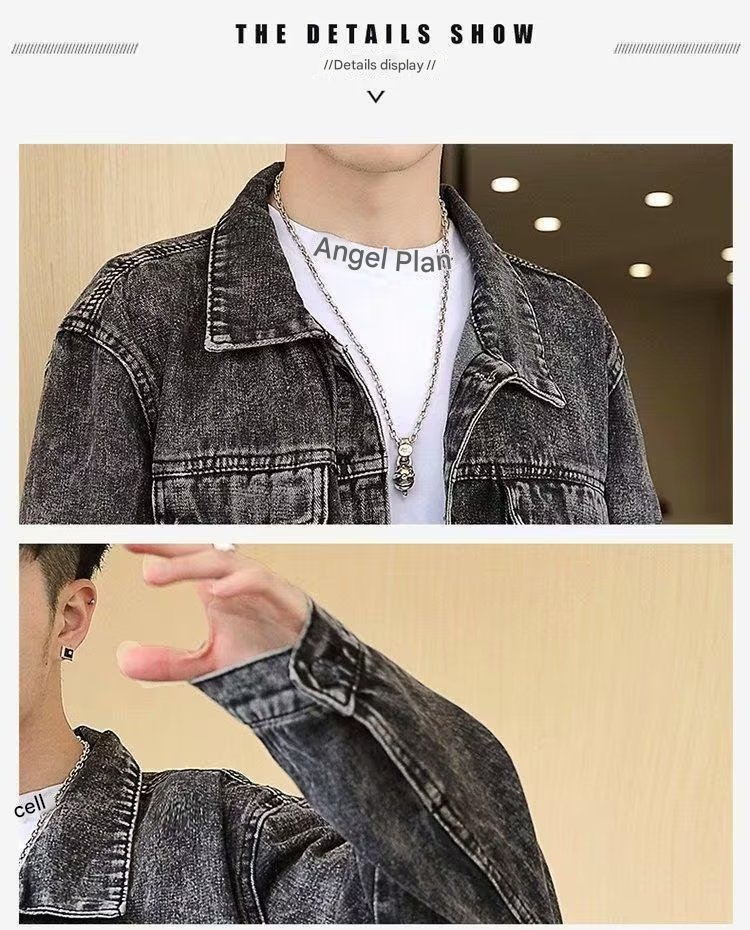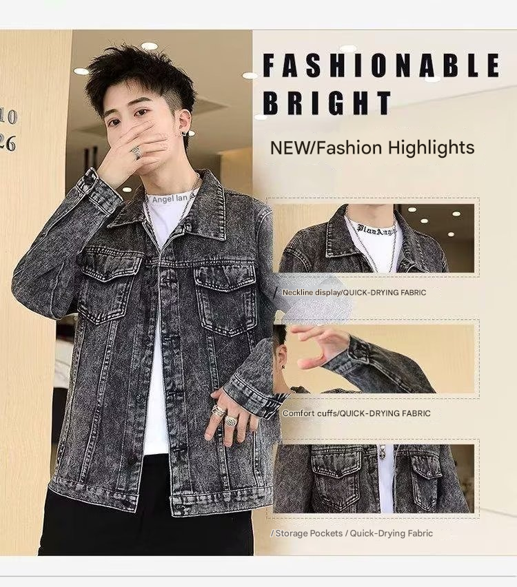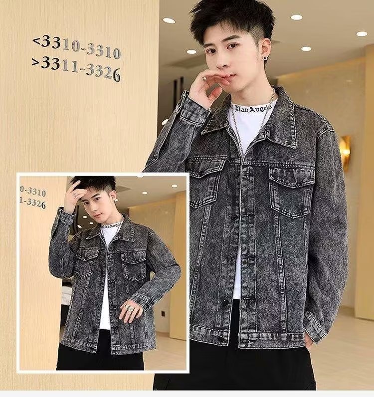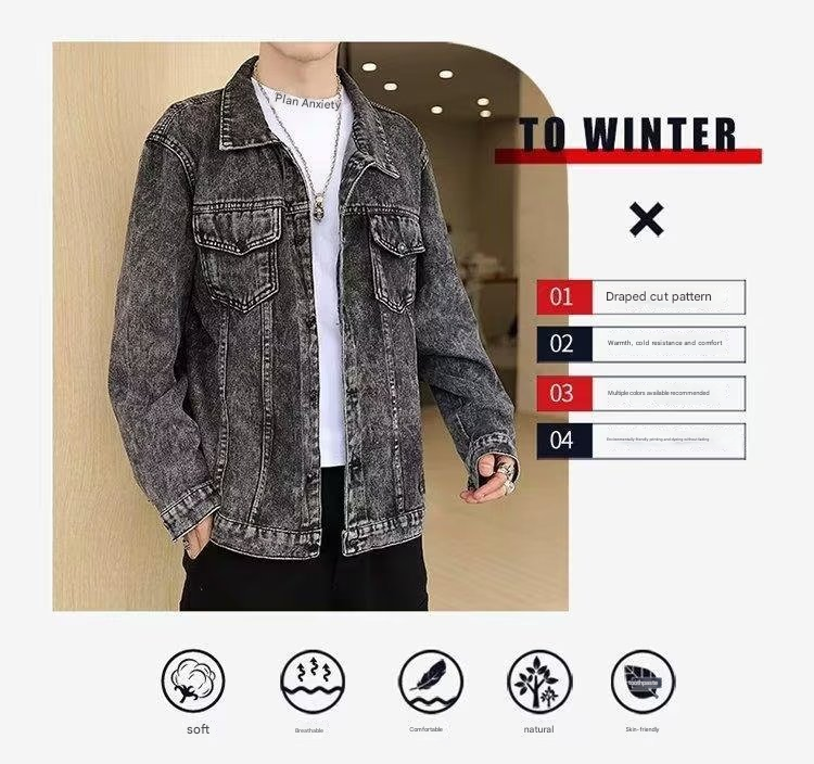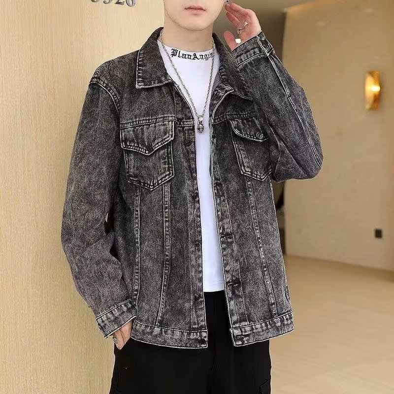 جاكت دينم رجالي شتوي بتصميم واسع، بلون رمادي داكن يتميز بياقة كلاسيكية وجيوب صدرية عملية