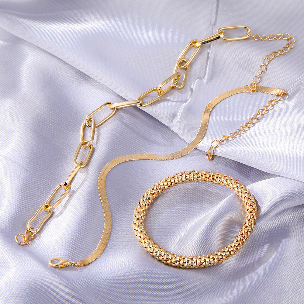 أساور نسائية بثلاث قطع قابلة للتعديل تتميز بتصميم يجمع بين سلاسل عريضة، وسلسلة مسطحة على شكل ثعبان، وسلسلة دائرية منقوشة