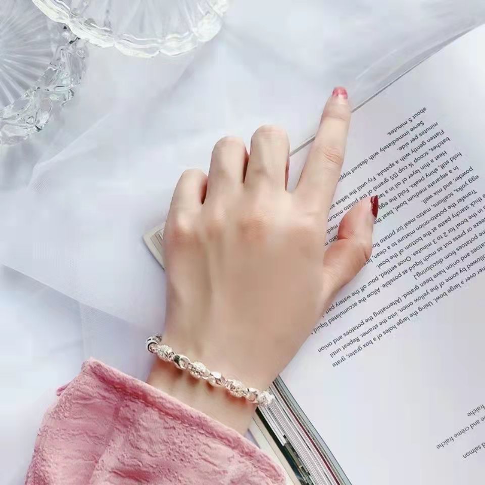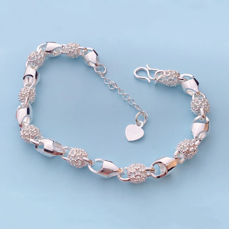 سوار نسائي بتصميم مزين بحبات كروية مفرغة الشكل يتخللها حلقات بيضاوية لامعة، مع سلسلة إضافية قابلة للتعديل