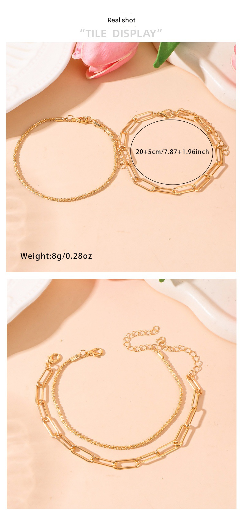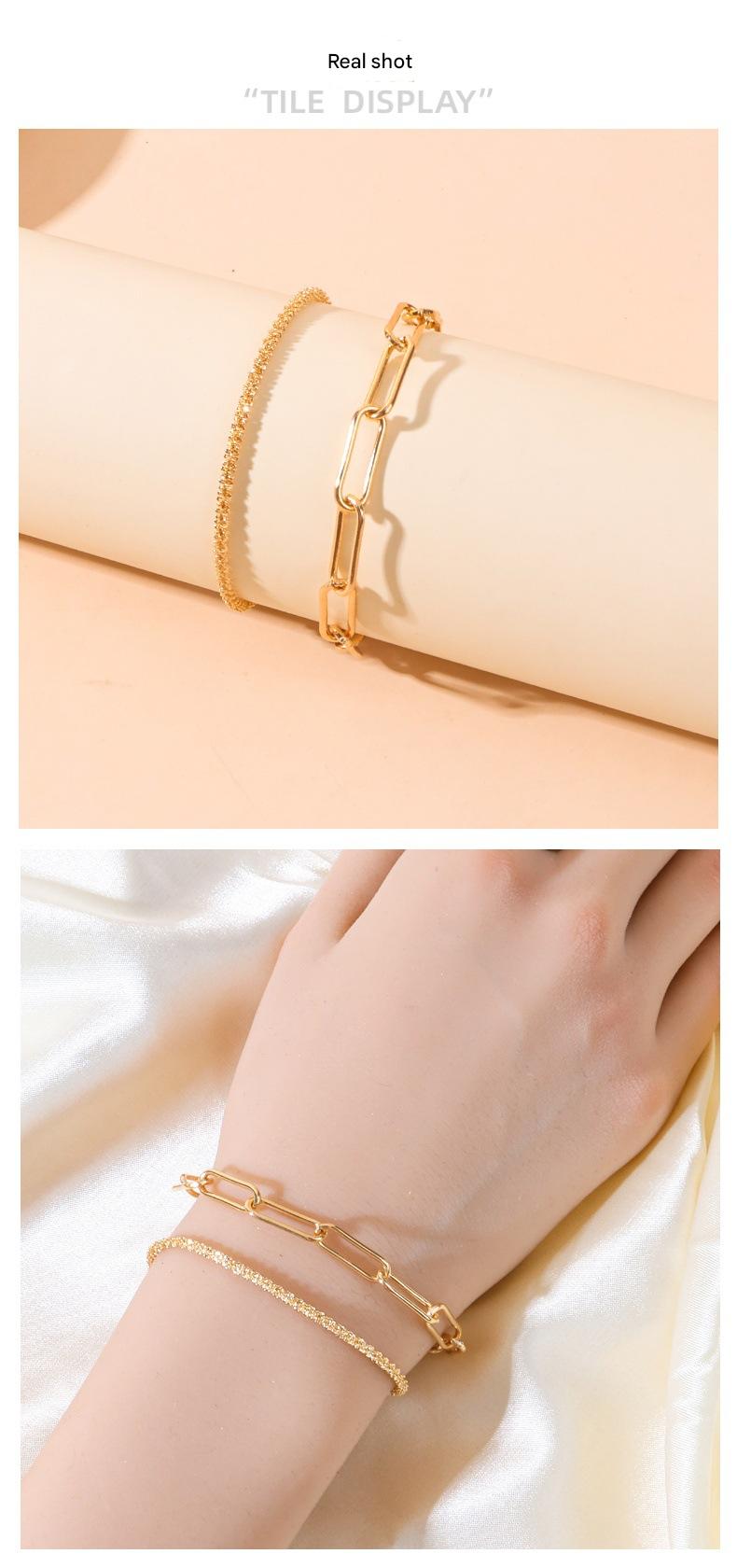 طقم أساور نسائيية بتصميم يجمع بين سلسلة سميكة على شكل حلقات مستطيلة وسلسلة رفيعة ذات نسيج محكم ولهما قفل قابل للتعديل