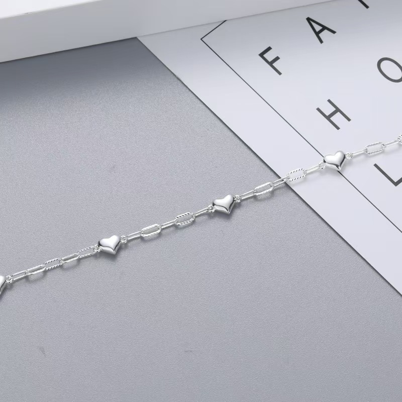 سوار نسائي يتميز بتصميم يجمع بين سلسلة من الحلقات البيضاوية وتتخللها زخارف ناعمة على شكل قلوب، قابلة للتعديل