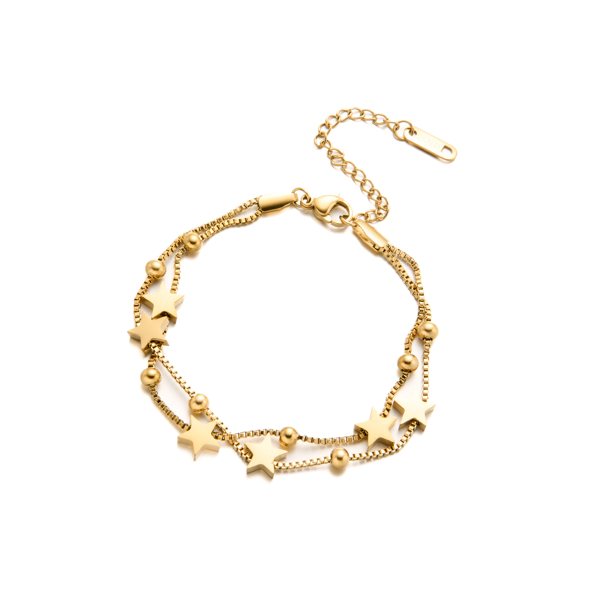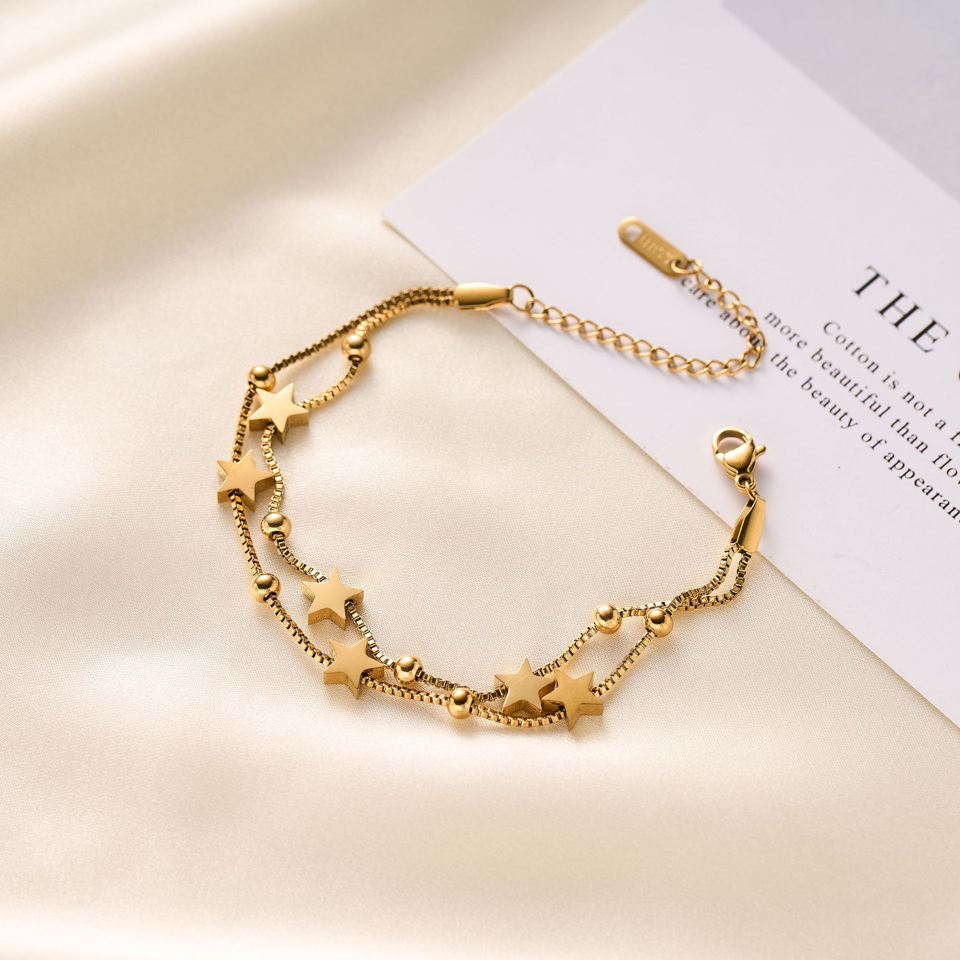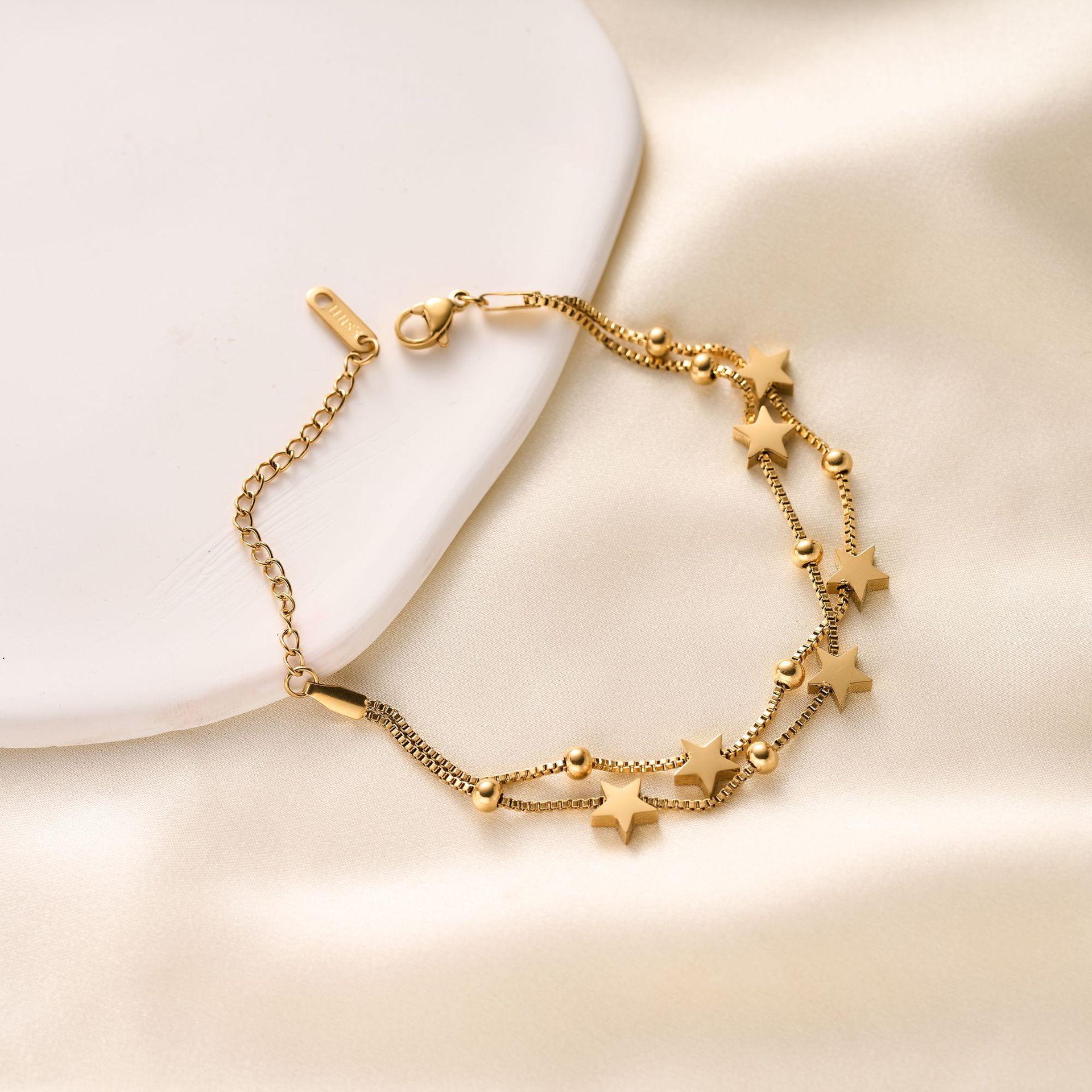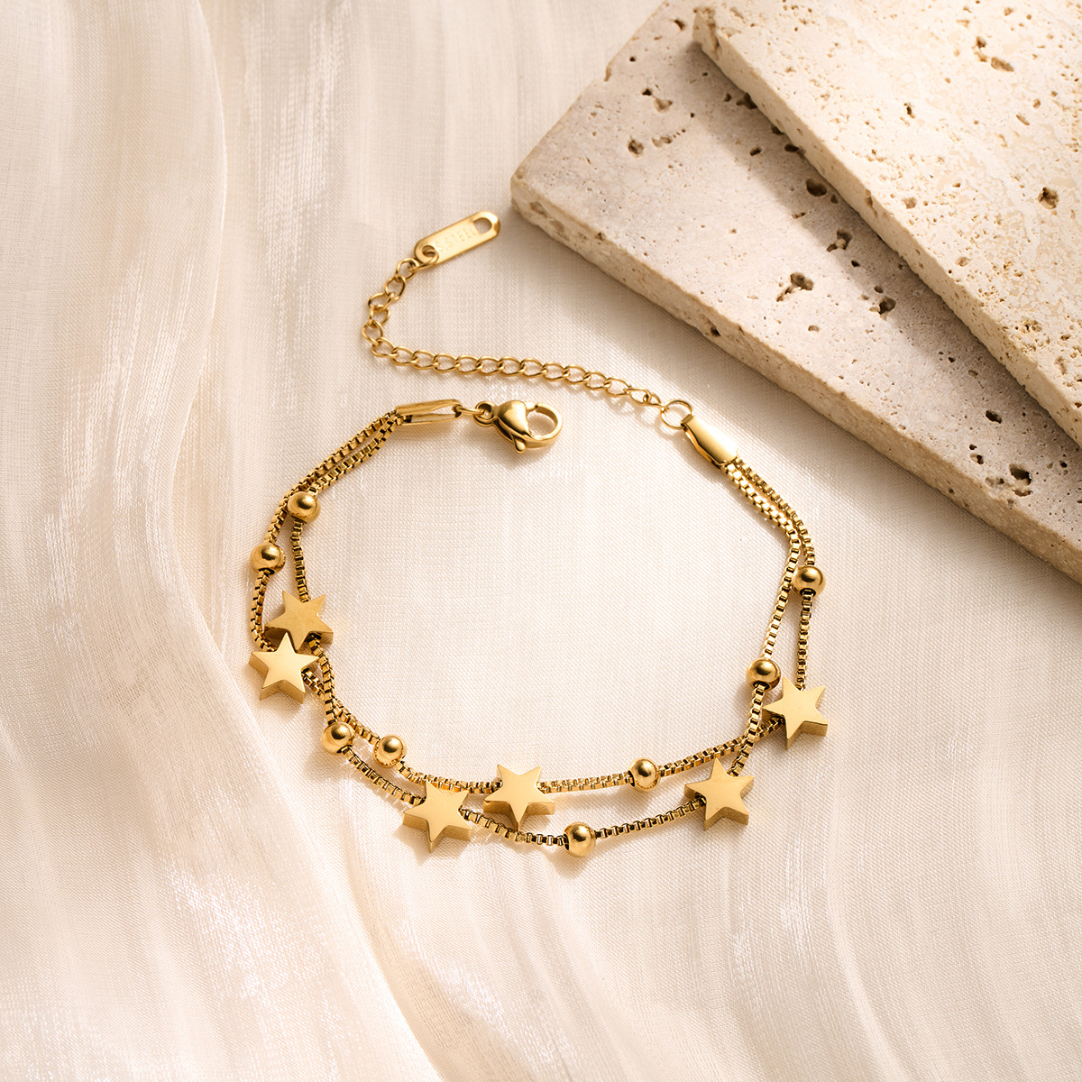 سوار نسائي مصنوع من الفولاذ المقاوم للصدأ يتميز بسلسلة خرزية وأخرى مزينة بشكل نجوم لامعة