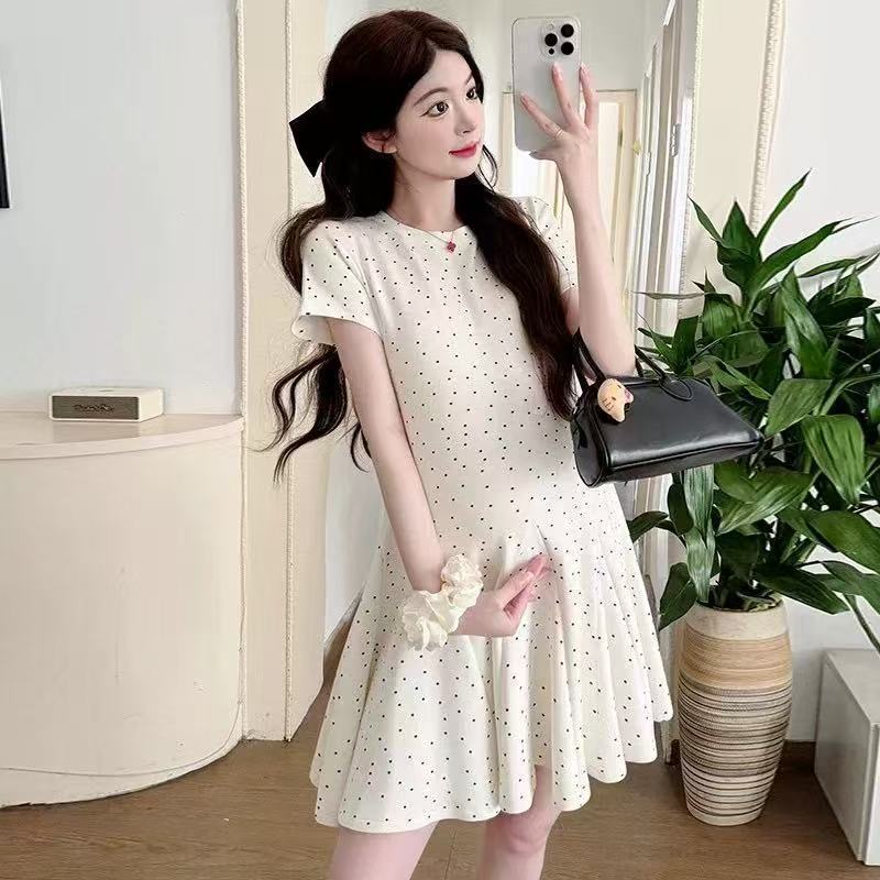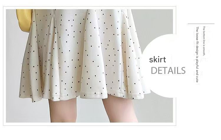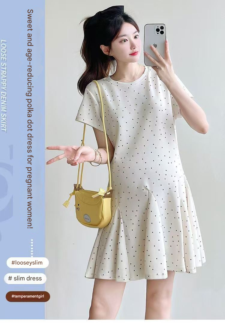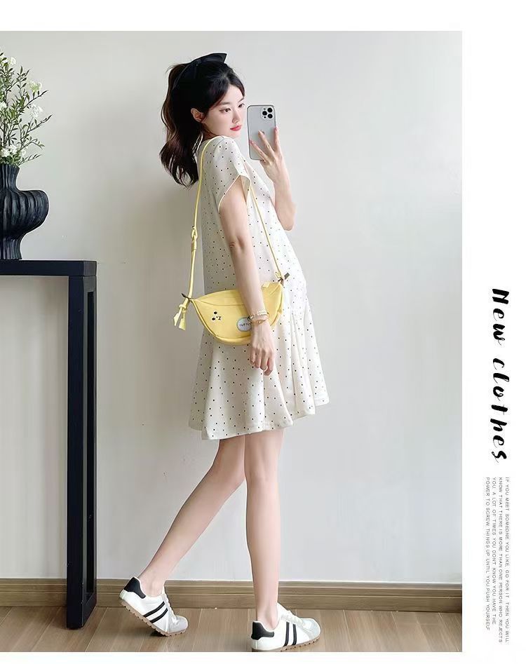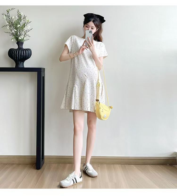 فستان نسائي قصير منقط بكسرات،بأكمام قصيرة، يتميز بتصميم فضفاض يناسب جميع مراحل الحمل، ويأتي مع شورت داخلي