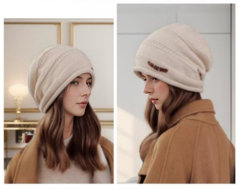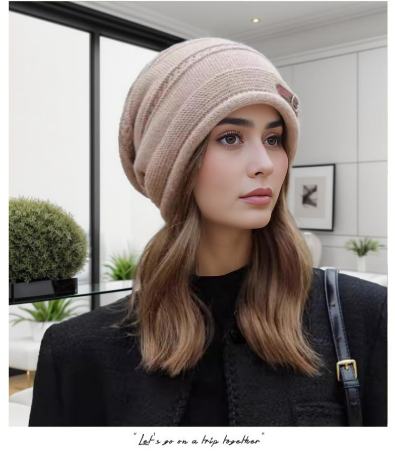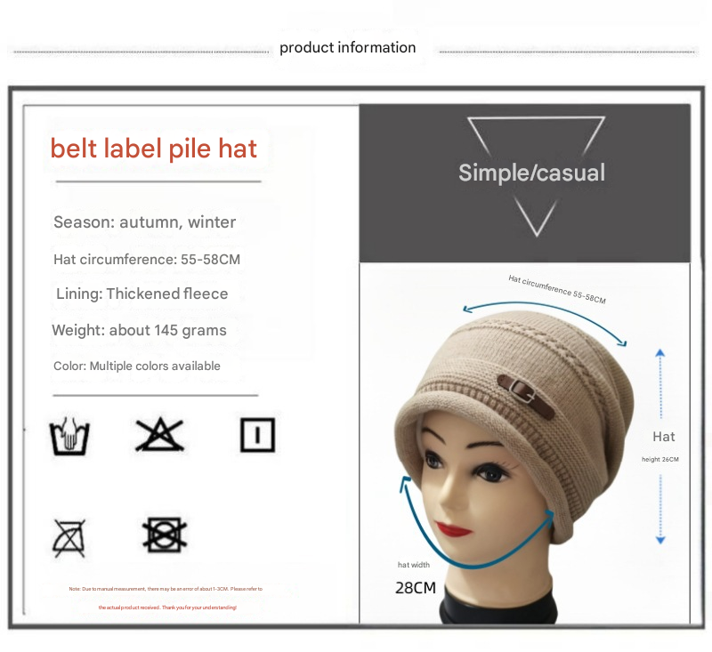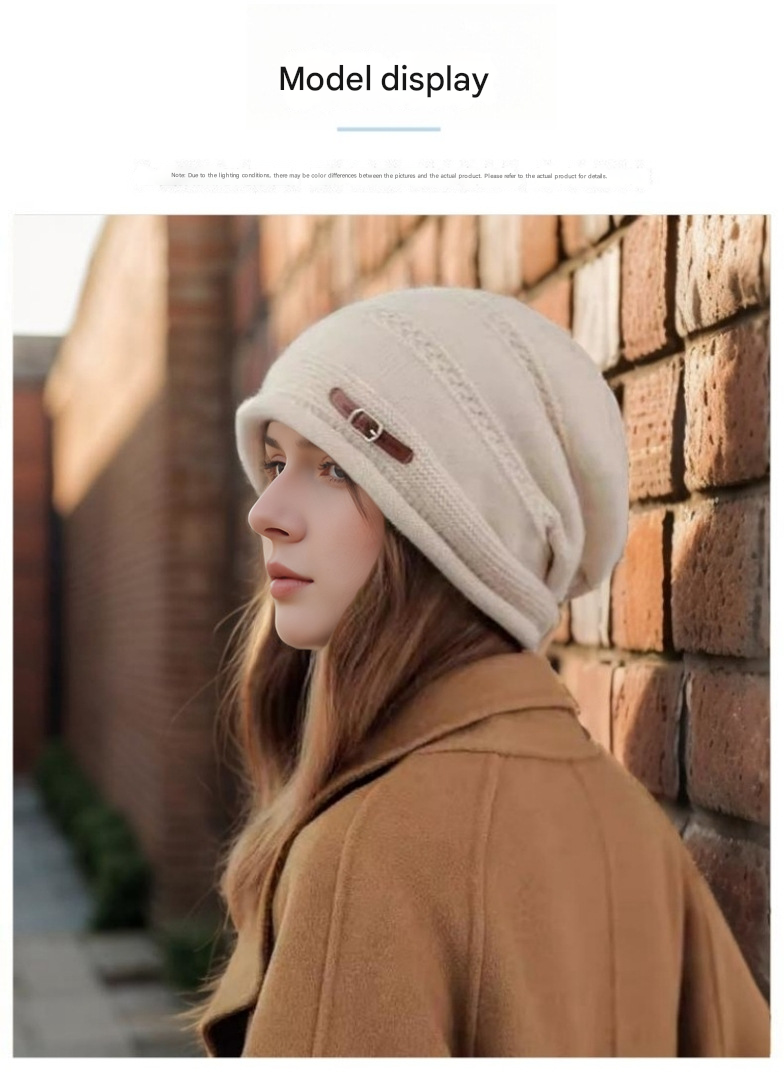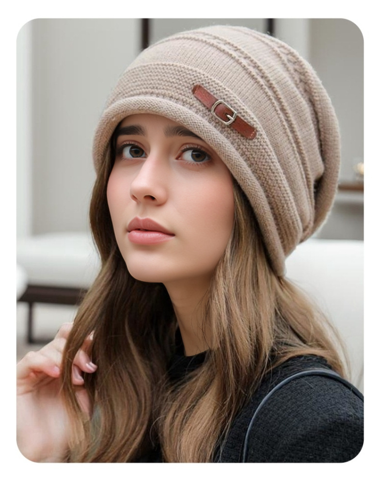 قبعة صغيرة محبوكة وعصرية للنساء، مبطنة بالصوف الدافئ، بتصميم فضفاض مع حزام جلد وزر إبزيم