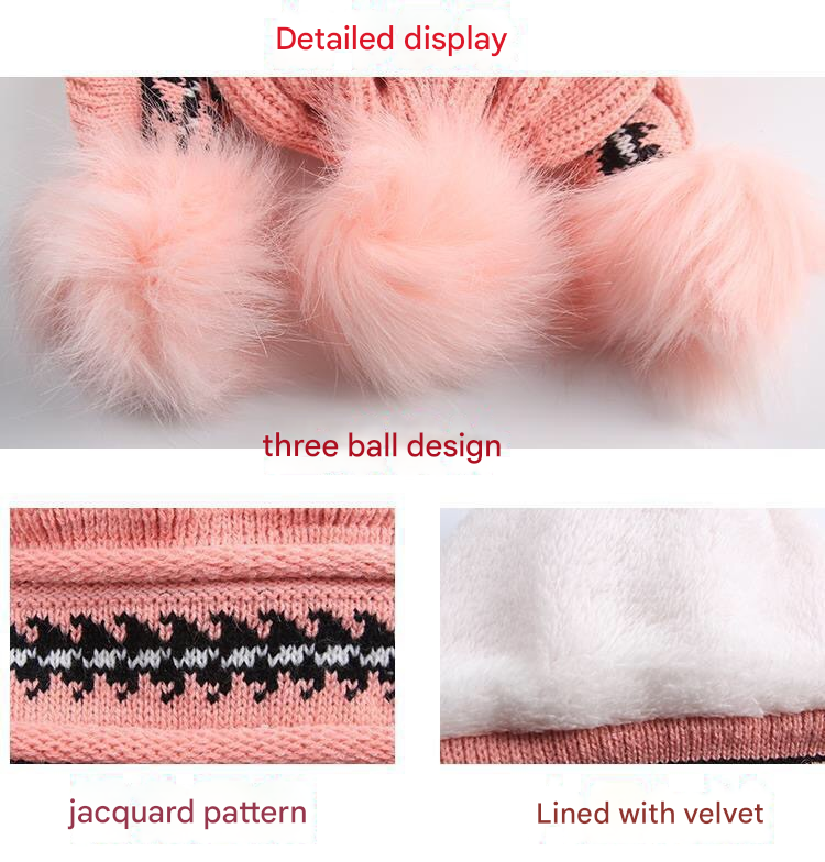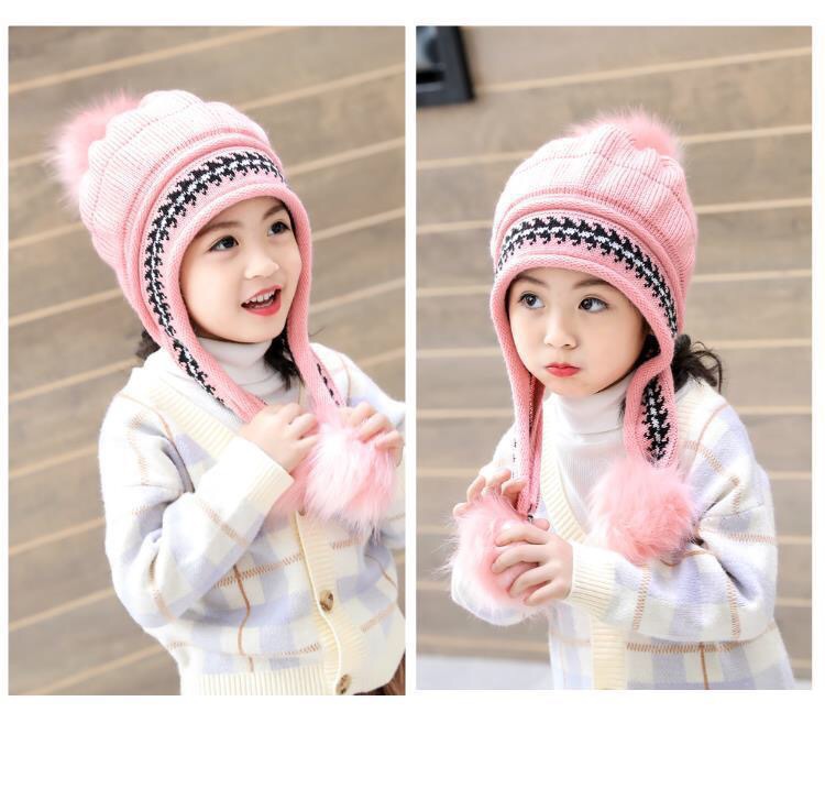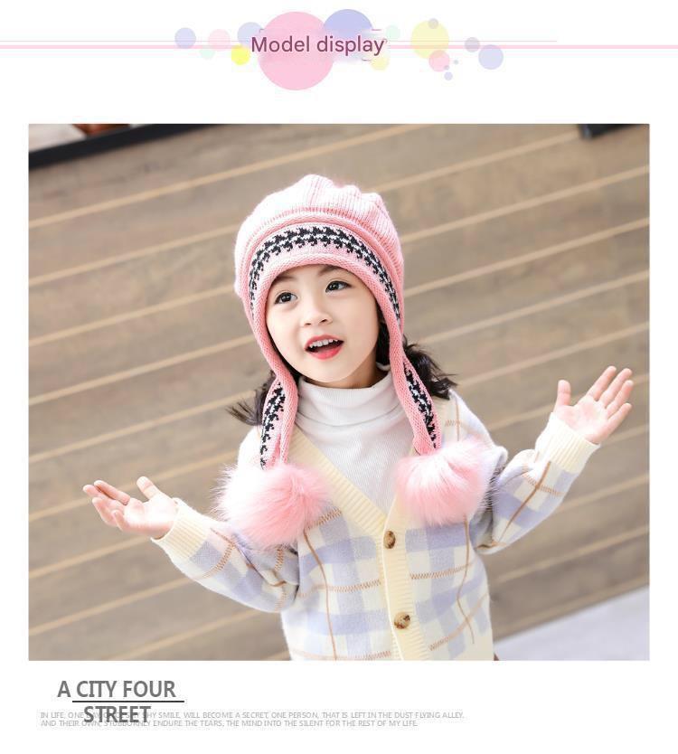 قبعة شتوية منسوجة ومحبوكة بناتي مع شريط مزخرف وكرات دائرية من الفرو صناعي (دلايات)