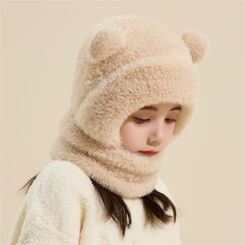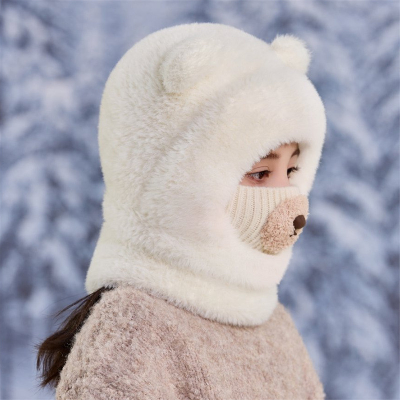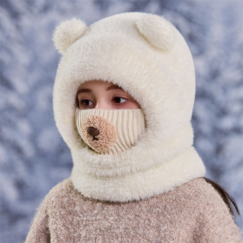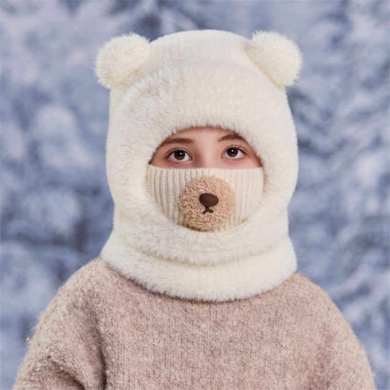 قبعة شتوية بناتي بأذنين بارزتين مع كمامة من نسيج محبوك عليها أنف الدب واقية للوجه والرقبة من البرد